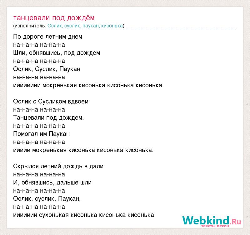 По дороге летним днем на-на-на на-на-на Шли, обнявшись, под дождем на-на-на на-на-на Ослик, Суслик, Паукан на-на-на на-на-на ииииииии мокренькая кисонька кисонька кисонька. Ослик с Сусликом вдвоем на-на-на на-на-на Танцевали под дождем. на-на-на на-на-на Помогал им Паукан на-на-на на-на-на иииии мокренькая кисонька кисонька кисонька. Скрылся летний дождь в дали на-на-на на-на-на И, обнявшись, дальше шли на-на-на на-на-на Ослик, суслик, Паукан, на-на-на на-на-на иииииии сухонькая кисонька кисонька кисонька