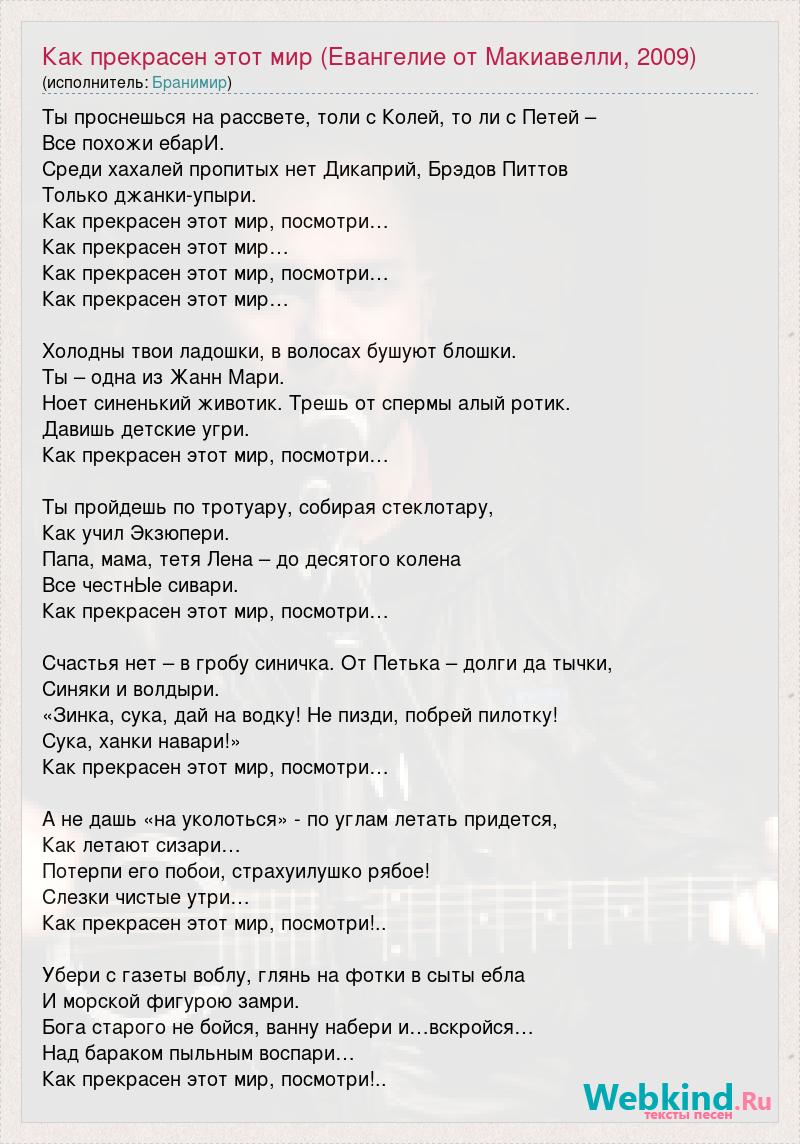 Ты проснешься на рассвете, толи с Колей, то ли с Петей – Все похожи ебарИ. Среди хахалей пропитых нет Дикаприй, Брэдов Питтов Только джанки-упыри. Как прекрасен этот мир, посмотри… Как прекрасен этот мир… Как прекрасен этот мир, посмотри… Как прекрасен этот мир… Холодны твои ладошки, в волосах бушуют блошки. Ты – одна из Жанн Мари. Ноет синенький животик. Трешь от спермы алый ротик. Давишь детские угри. Как прекрасен этот мир, посмотри… Ты пройдешь по тротуару, собирая стеклотару, Как учил Экзюпери. Папа, мама, тетя Лена – до десятого колена Все честнЫе сивари. Как прекрасен этот мир, посмотри… Счастья нет – в гробу синичка. От Петька – долги да тычки, Синяки и волдыри. «Зинка, сука, дай на водку! Не пизди, побрей пилотку! Сука, ханки навари!» Как прекрасен этот мир, посмотри… А не дашь «на уколоться» - по углам летать придется, Как летают сизари… Потерпи его побои, страхуилушко рябое! Слезки чистые утри… Как прекрасен этот мир, посмотри!.. Убери с газеты воблу, глянь на фотки в сыты ебла И морской фигурою замри. Бога старого не бойся, ванну набери и…вскройся… Над бараком пыльным воспари… Как прекрасен этот мир, посмотри!..