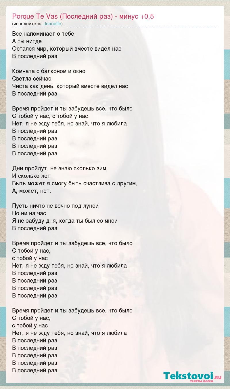 Все напоминает о тебе А ты нигде Остался мир, который вместе видел нас В последний раз Комната с балконом и окно Светла сейчас Чиста как день, который вместе видел нас В последний раз Время пройдет и ты забудешь все, что было С тобой у нас, с тобой у нас Нет, я не жду тебя, но знай, что я любила В последний раз В последний раз В последний раз В последний раз Дни пройдут, не знаю сколько зим, И сколько лет Быть может я смогу быть счастлива с другим, А, может, нет. Пусть ничто не вечно под луной Но ни на час Я не забуду дня, когда ты был со мной В последний раз Время пройдет и ты забудешь все, что было С тобой у нас, с тобой у нас Нет, я не жду тебя, но знай, что я любила В последний раз В последний раз В последний раз В последний раз Время пройдет и ты забудешь все, что было С тобой у нас, с тобой у нас Нет, я не жду тебя, но знай, что я любила В последний раз В последний раз В последний раз В последний раз В последний раз