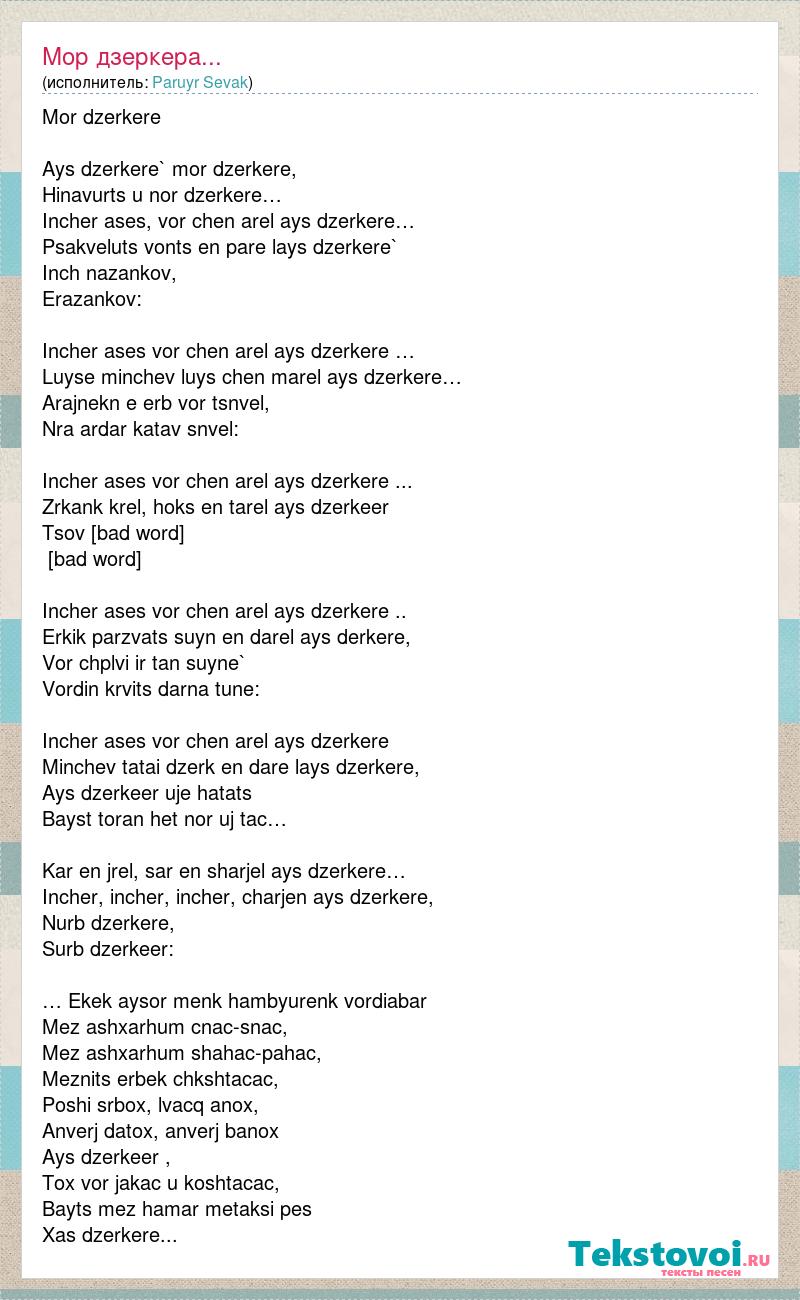 Mor dzerkere Ays dzerkere` mor dzerkere, Hinavurts u nor dzerkere… Incher ases, vor chen arel ays dzerkere… Psakveluts vonts en pare lays dzerkere` Inch nazankov, Erazankov: Incher ases vor chen arel ays dzerkere … Luyse minchev luys chen marel ays dzerkere… Arajnekn e erb vor tsnvel, Nra ardar katav snvel: Incher ases vor chen arel ays dzerkere ... Zrkank krel, hoks en tarel ays dzerkeer Tsov [bad word] [bad word] Incher ases vor chen arel ays dzerkere .. Erkik parzvats suyn en darel ays derkere, Vor chplvi ir tan suyne` Vordin krvits darna tune: Incher ases vor chen arel ays dzerkere Minchev tatai dzerk en dare lays dzerkere, Ays dzerkeer uje hatats Bayst toran het nor uj tac… Kar en jrel, sar en sharjel ays dzerkere… Incher, incher, incher, charjen ays dzerkere, Nurb dzerkere, Surb dzerkeer: … Ekek aysor menk hambyurenk vordiabar Mez ashxarhum cnac-snac, Mez ashxarhum shahac-pahac, Meznits erbek chkshtacac, Poshi srbox, lvacq anox, Anverj datox, anverj banox Ays dzerkeer , Tox vor jakac u koshtacac, Bayts mez hamar metaksi pes Xas dzerkere...