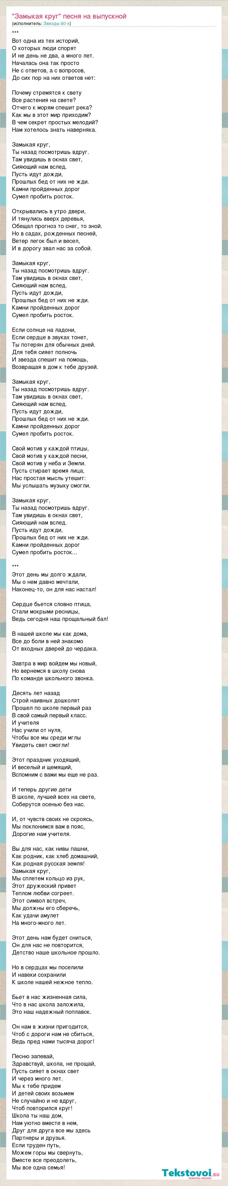 *** Вот одна из тех историй, О которых люди спорят И не день не два, а много лет. Началась она так просто Не с ответов, а с вопросов, До сих пор на них ответов нет: Почему стремятся к свету Все растения на свете? Отчего к морям спешит река? Как мы в этот мир приходим? В чем секрет простых мелодий? Нам хотелось знать наверняка. Замыкая круг, Ты назад посмотришь вдруг. Там увидишь в окнах свет, Сияющий нам вслед. Пусть идут дожди, Прошлых бед от них не жди. Камни пройденных дорог Сумел пробить росток. Открывались в утро двери, И тянулись вверх деревья, Обещал прогноз то снег, то зной. Но в садах, рожденных песней, Ветер легок был и весел, И в дорогу звал нас за собой. Замыкая круг, Ты назад посмотришь вдруг. Там увидишь в окнах свет, Сияющий нам вслед. Пусть идут дожди, Прошлых бед от них не жди. Камни пройденных дорог Сумел пробить росток. Если солнце на ладони, Если сердце в звуках тонет, Ты потерян для обычных дней. Для тебя сияет полночь И звезда спешит на помощь, Возвращая в дом к тебе друзей. Замыкая круг, Ты назад посмотришь вдруг. Там увидишь в окнах свет, Сияющий нам вслед. Пусть идут дожди, Прошлых бед от них не жди. Камни пройденных дорог Сумел пробить росток. Свой мотив у каждой птицы, Свой мотив у каждой песни, Свой мотив у неба и Земли. Пусть стирает время лица, Нас простая мысль утешит: Мы услышать музыку смогли. Замыкая круг, Ты назад посмотришь вдруг. Там увидишь в окнах свет, Сияющий нам вслед. Пусть идут дожди, Прошлых бед от них не жди. Камни пройденных дорог Сумел пробить росток... *** Этот день мы долго ждали, Мы о нем давно мечтали, Наконец-то, он для нас настал! Сердце бьется словно птица, Стали мокрыми ресницы, Ведь сегодня наш прощальный бал! В нашей школе мы как дома, Все до боли в ней знакомо От входных дверей до чердака. Завтра в мир войдем мы новый, Но вернемся в школу снова По команде школьного звонка. Десять лет назад Строй наивных дошколят Прошел по школе первый раз В свой самый первый класс. И учителя Нас учили от нуля, Чтобы все мы среди мглы Увидеть свет смогли! Этот праздник уходящий, И веселый и щемящий, Вспомним с вами мы еще не раз. И теперь другие дети В школе, лучшей всех на свете, Соберутся осенью без нас. И, от чувств своих не скроясь, Мы поклонимся вам в пояс, Дорогие нам учителя. Вы для нас, как нивы пашни, Как родник, как хлеб домашний, Как родная русская земля! Замыкая круг, Мы сплетем кольцо из рук, Этот дружеский привет Теплом любви согреет. Этот символ встреч, Мы должны его сберечь, Как удачи амулет На много-много лет. Этот день нам будет сниться, Он для нас не повторится, Детство наше школьное прошло. Но в сердцах мы поселили И навеки сохранили К школе нашей нежное тепло. Бьет в нас жизненная сила, Что в нас школа заложила, Это наш надежный поплавок. Он нам в жизни пригодится, Чтоб с дороги нам не сбиться, Ведь пред нами тысяча дорог! Песню запевай, Здравствуй, школа, не прощай, Пусть сияет в окнах свет И через много лет. Мы к тебе придем И детей своих возьмем Не случайно и не вдруг, Чтоб повторился круг! Школа ты наш дом, Нам уютно вместе в нем, Друг для друга все мы здесь Партнеры и друзья. Если труден путь, Можем горы мы свернуть, Вместе все преодолеть, Мы все одна семья!