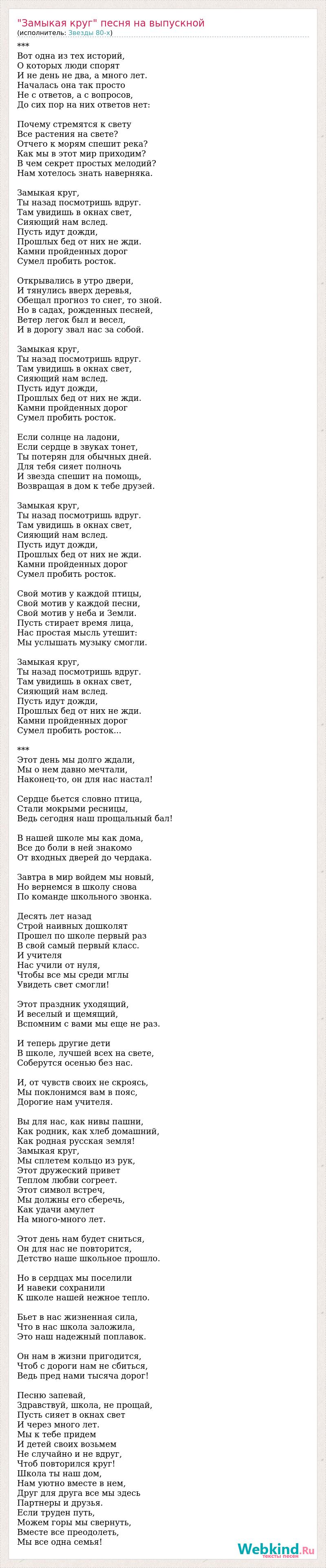 *** Вот одна из тех историй, О которых люди спорят И не день не два, а много лет. Началась она так просто Не с ответов, а с вопросов, До сих пор на них ответов нет: Почему стремятся к свету Все растения на свете? Отчего к морям спешит река? Как мы в этот мир приходим? В чем секрет простых мелодий? Нам хотелось знать наверняка. Замыкая круг, Ты назад посмотришь вдруг. Там увидишь в окнах свет, Сияющий нам вслед. Пусть идут дожди, Прошлых бед от них не жди. Камни пройденных дорог Сумел пробить росток. Открывались в утро двери, И тянулись вверх деревья, Обещал прогноз то снег, то зной. Но в садах, рожденных песней, Ветер легок был и весел, И в дорогу звал нас за собой. Замыкая круг, Ты назад посмотришь вдруг. Там увидишь в окнах свет, Сияющий нам вслед. Пусть идут дожди, Прошлых бед от них не жди. Камни пройденных дорог Сумел пробить росток. Если солнце на ладони, Если сердце в звуках тонет, Ты потерян для обычных дней. Для тебя сияет полночь И звезда спешит на помощь, Возвращая в дом к тебе друзей. Замыкая круг, Ты назад посмотришь вдруг. Там увидишь в окнах свет, Сияющий нам вслед. Пусть идут дожди, Прошлых бед от них не жди. Камни пройденных дорог Сумел пробить росток. Свой мотив у каждой птицы, Свой мотив у каждой песни, Свой мотив у неба и Земли. Пусть стирает время лица, Нас простая мысль утешит: Мы услышать музыку смогли. Замыкая круг, Ты назад посмотришь вдруг. Там увидишь в окнах свет, Сияющий нам вслед. Пусть идут дожди, Прошлых бед от них не жди. Камни пройденных дорог Сумел пробить росток... *** Этот день мы долго ждали, Мы о нем давно мечтали, Наконец-то, он для нас настал! Сердце бьется словно птица, Стали мокрыми ресницы, Ведь сегодня наш прощальный бал! В нашей школе мы как дома, Все до боли в ней знакомо От входных дверей до чердака. Завтра в мир войдем мы новый, Но вернемся в школу снова По команде школьного звонка. Десять лет назад Строй наивных дошколят Прошел по школе первый раз В свой самый первый класс. И учителя Нас учили от нуля, Чтобы все мы среди мглы Увидеть свет смогли! Этот праздник уходящий, И веселый и щемящий, Вспомним с вами мы еще не раз. И теперь другие дети В школе, лучшей всех на свете, Соберутся осенью без нас. И, от чувств своих не скроясь, Мы поклонимся вам в пояс, Дорогие нам учителя. Вы для нас, как нивы пашни, Как родник, как хлеб домашний, Как родная русская земля! Замыкая круг, Мы сплетем кольцо из рук, Этот дружеский привет Теплом любви согреет. Этот символ встреч, Мы должны его сберечь, Как удачи амулет На много-много лет. Этот день нам будет сниться, Он для нас не повторится, Детство наше школьное прошло. Но в сердцах мы поселили И навеки сохранили К школе нашей нежное тепло. Бьет в нас жизненная сила, Что в нас школа заложила, Это наш надежный поплавок. Он нам в жизни пригодится, Чтоб с дороги нам не сбиться, Ведь пред нами тысяча дорог! Песню запевай, Здравствуй, школа, не прощай, Пусть сияет в окнах свет И через много лет. Мы к тебе придем И детей своих возьмем Не случайно и не вдруг, Чтоб повторился круг! Школа ты наш дом, Нам уютно вместе в нем, Друг для друга все мы здесь Партнеры и друзья. Если труден путь, Можем горы мы свернуть, Вместе все преодолеть, Мы все одна семья!