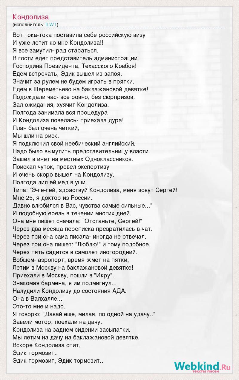 Вот тока-тока поставила себе российскую визу И уже летит ко мне Кондолиза!! Я все замутил- рад стараться. В гости едет представитель администрации Господина Президента, Техасского Ковбоя! Едем встречать, Эдик вышел из запоя. Значит за рулем не будем играть в прятки. Едем в Шереметьево на баклажановой девятке! Подождали час- все ровно, без сюрпризов. Зал ожидания, хуячит Кондолиза. Полгода занимала вся процедура И Кондолиза повелась- приехала дура! План был очень четкий, Мы шли на риск. Я подключил свой неебический английский. Надо было вымутить представительницу власти. Зашел в инет на местных Одноклассников. Поискал чуток, провел экспертизу И очень скоро вышел на Кондолизу. Полгода лил ей мед в уши. Типа: "Э-ге-гей, здраствуй Кондолиза, меня зовут Сергей! Мне 25, я доктор из России. Давно влюбился в Вас, чувства самые сильные..." И подобную ерезь в течении многих дней. Она мне пишет сначала: "Отстаньте, Сергей!" Через два месяца переписка превратилась в чат. Через три она сама писала- иногда не отвечал. Через три она пишет: "Люблю!" и тому подобное. Через пять садится в самолет иногородний. Вобщем- аэропорт, время жмет на пятки, Летим в Москву на баклажановой девятке! Приехали в Москву, пошли в "Икру". Знакомая бармена, я им подмигнул... Налудили Кондолизу до состояния АДА. Она в Валхалле... Это-то мне и надо. Я говорю: "Давай еще, милая, по одной на удачу.." Завели мотор, поехали на дачу. Кондолиза на заднем сидении засыпатки. Мы летим на дачу на баклажановой девятке. Вскоре Кондолиза спит, Эдик тормозит.. Эдик тормозит, Эдик тормозит..
