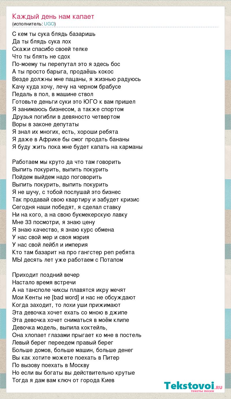 С кем ты сука блядь базаришь Да ты блядь сука лох Скажи спасибо своей телке Что ты блять не сдох По-моему ты перепутал это я здесь бос А ты просто барыга, продаёшь кокос Везде должны мне пацаны, я жизнью радуюсь Качу куда хочу, лечу на черном брабусе Педаль в пол, в машине ствол Готовьте деньги суки это ЮГО к вам пришел Я занимаюсь бизнесом, а также спортом Друзья погибли в девяносто четвертом Воры в законе депутаты Я знал их многих, есть, хороши ребята Я даже в Африке бы смог продать бананы Я буду жить пока мне будет капать на карманы Работаем мы круто да что там говорить Выпить покурить, выпить покурить Пойдем выйдем надо поговорить Выпить покурить, выпить покурить Я не шучу, с тобой послушай это бизнес Так продавай свою квартиру и забудет кризис Сегодня наши победят, я сделал ставку Ни на кого, а на свою букмекерскую лавку Мне 33 посмотри, я знаю цену Я знаю качество, я знаю курс обмена У нас свой мер и своя мэрия У нас свой лейбл и империя Кто там базарит на про гангстер реп ребята МЫ десять лет уже работаем с Потапом Приходит поздний вечер Настало время встречи А на тансполе чиксы плавятся икру мечят Мои Кенты не [bad word] и нас не обсуждают Когда заходит, то лохи уши прижимают Эта девочка хочет ехать со мною в джипе Эта девочка хочет сниматься в моём клипе Девочка модель, выпила коктейль, Она хлопает глазами прыгает ко мне в постель Левый берег переедем правый берег Больше домов, больше машин, больше денег Вы как хотите можете поехать в Питер По вызову поехать в Москву Но если вы богаты вы действительно крутые Тогда я дам вам ключ от города Киев