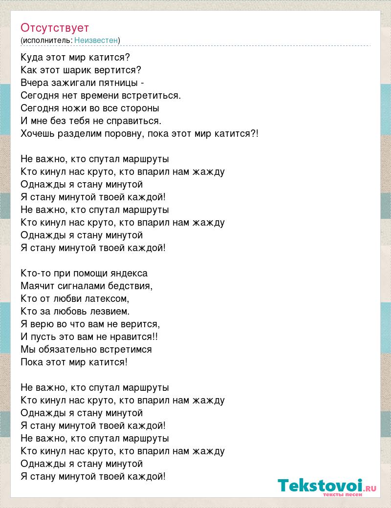 Куда этот мир катится? Как этот шарик вертится? Вчера зажигали пятницы - Сегодня нет времени встретиться. Сегодня ножи во все стороны И мне без тебя не справиться. Хочешь разделим поровну, пока этот мир катится?! Не важно, кто спутал маршруты Кто кинул нас круто, кто впарил нам жажду Однажды я стану минутой Я стану минутой твоей каждой! Не важно, кто спутал маршруты Кто кинул нас круто, кто впарил нам жажду Однажды я стану минутой Я стану минутой твоей каждой! Кто-то при помощи яндекса Маячит сигналами бедствия, Кто от любви латексом, Кто за любовь лезвием. Я верю во что вам не верится, И пусть это вам не нравится!! Мы обязательно встретимся Пока этот мир катится! Не важно, кто спутал маршруты Кто кинул нас круто, кто впарил нам жажду Однажды я стану минутой Я стану минутой твоей каждой! Не важно, кто спутал маршруты Кто кинул нас круто, кто впарил нам жажду Однажды я стану минутой Я стану минутой твоей каждой!