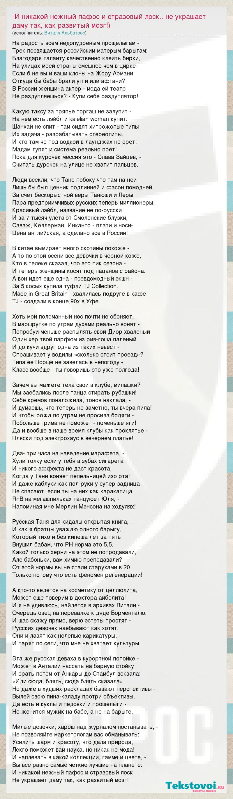 Главная→Исполнители→Виталя Альбатрос→-И никакой нежный пафос и стразовый лоск.. не украшает даму так, как развит