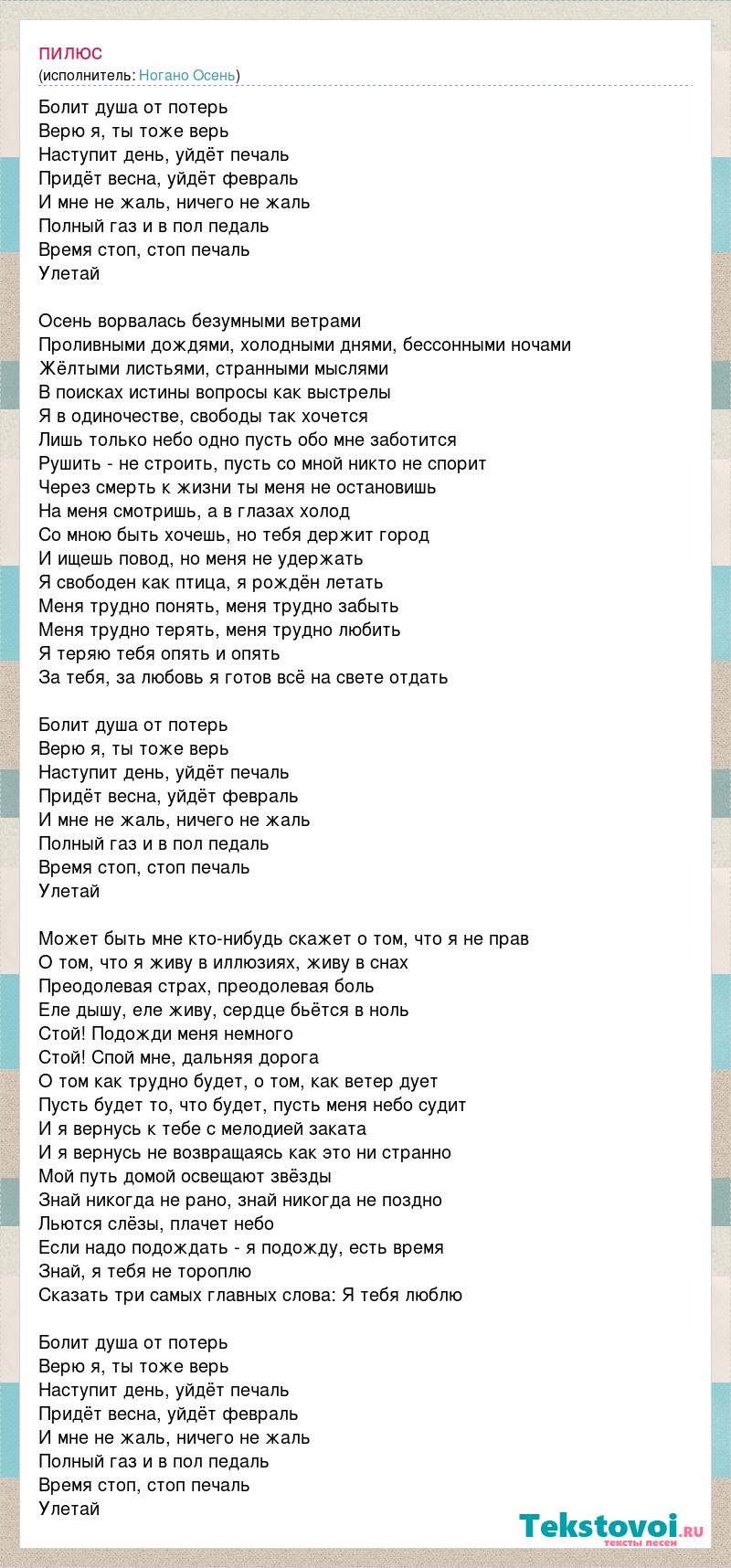 Болит душа от потерь Верю я, ты тоже верь Наступит день, уйдёт печаль Придёт весна, уйдёт февраль И мне не жаль, ничего не жаль Полный газ и в пол педаль Время стоп, стоп печаль Улетай Осень ворвалась безумными ветрами Проливными дождями, холодными днями, бессонными ночами Жёлтыми листьями, странными мыслями В поисках истины вопросы как выстрелы Я в одиночестве, свободы так хочется Лишь только небо одно пусть обо мне заботится Рушить - не строить, пусть со мной никто не спорит Через смерть к жизни ты меня не остановишь На меня смотришь, а в глазах холод Со мною быть хочешь, но тебя держит город И ищешь повод, но меня не удержать Я свободен как птица, я рождён летать Меня трудно понять, меня трудно забыть Меня трудно терять, меня трудно любить Я теряю тебя опять и опять За тебя, за любовь я готов всё на свете отдать Болит душа от потерь Верю я, ты тоже верь Наступит день, уйдёт печаль Придёт весна, уйдёт февраль И мне не жаль, ничего не жаль Полный газ и в пол педаль Время стоп, стоп печаль Улетай Может быть мне кто-нибудь скажет о том, что я не прав О том, что я живу в иллюзиях, живу в снах Преодолевая страх, преодолевая боль Еле дышу, еле живу, сердце бьётся в ноль Стой! Подожди меня немного Стой! Спой мне, дальняя дорога О том как трудно будет, о том, как ветер дует Пусть будет то, что будет, пусть меня небо судит И я вернусь к тебе с мелодией заката И я вернусь не возвращаясь как это ни странно Мой путь домой освещают звёзды Знай никогда не рано, знай никогда не поздно Льются слёзы, плачет небо Если надо подождать - я подожду, есть время Знай, я тебя не тороплю Сказать три самых главных слова: Я тебя люблю Болит душа от потерь Верю я, ты тоже верь Наступит день, уйдёт печаль Придёт весна, уйдёт февраль И мне не жаль, ничего не жаль Полный газ и в пол педаль Время стоп, стоп печаль Улетай