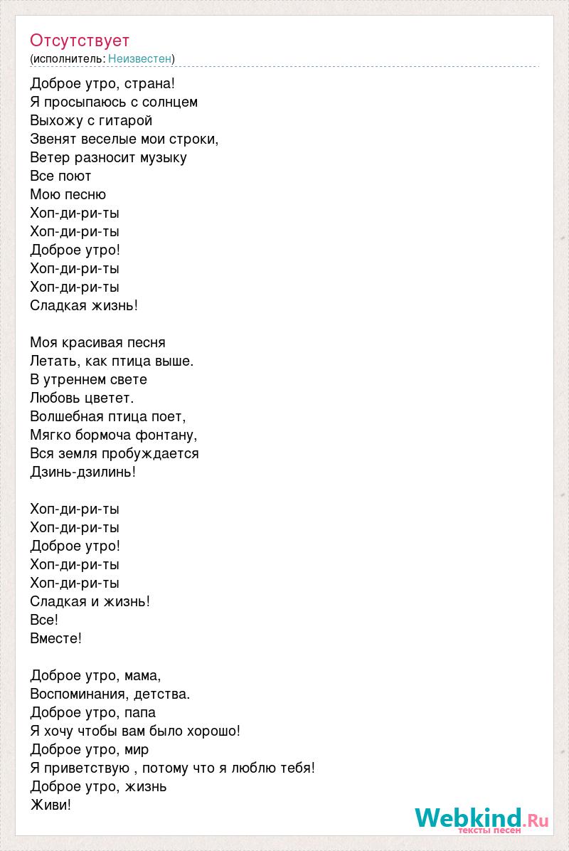 Доброе утро, страна! Я просыпаюсь с солнцем Выхожу с гитарой Звенят веселые мои строки, Ветер разносит музыку Все поют Мою песню Хоп-ди-ри-ты Хоп-ди-ри-ты Доброе утро! Хоп-ди-ри-ты Хоп-ди-ри-ты Сладкая жизнь! Моя красивая песня Летать, как птица выше. В утреннем свете Любовь цветет. Волшебная птица поет, Мягко бормоча фонтану, Вся земля пробуждается Дзинь-дзилинь! Хоп-ди-ри-ты Хоп-ди-ри-ты Доброе утро! Хоп-ди-ри-ты Хоп-ди-ри-ты Сладкая и жизнь! Все! Вместе! Доброе утро, мама, Воспоминания, детства. Доброе утро, папа Я хочу чтобы вам было хорошо! Доброе утро, мир Я приветствую , потому что я люблю тебя! Доброе утро, жизнь Живи!