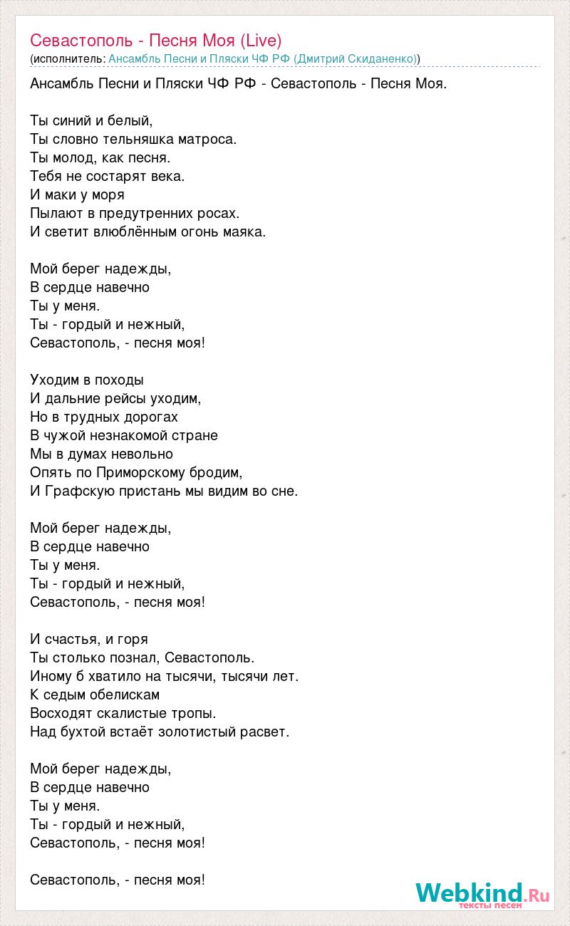 Ансамбль Песни и Пляски ЧФ РФ - Севастополь - Песня Моя. Ты синий и белый, Ты словно тельняшка матроса. Ты молод, как песня. Тебя не состарят века. И маки у моря Пылают в предутренних росах. И светит влюблённым огонь маяка. Мой берег надежды, В сердце навечно Ты у меня. Ты - гордый и нежный, Севастополь, - песня моя! Уходим в походы И дальние рейсы уходим, Но в трудных дорогах В чужой незнакомой стране Мы в думах невольно Опять по Приморскому бродим, И Графскую пристань мы видим во сне. Мой берег надежды, В сердце навечно Ты у меня. Ты - гордый и нежный, Севастополь, - песня моя! И счастья, и горя Ты столько познал, Севастополь. Иному б хватило на тысячи, тысячи лет. К седым обелискам Восходят скалистые тропы. Над бухтой встаёт золотистый расвет. Мой берег надежды, В сердце навечно Ты у меня. Ты - гордый и нежный, Севастополь, - песня моя! Севастополь, - песня моя!
