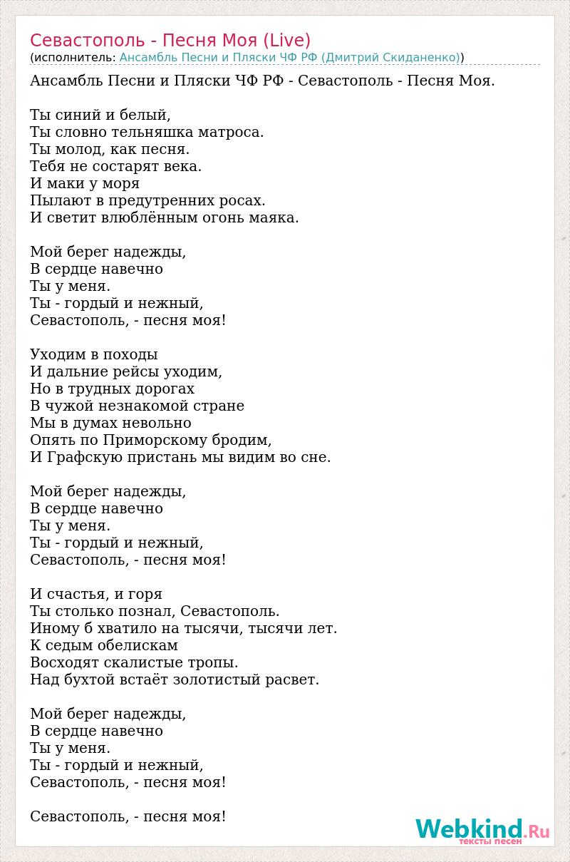 Ансамбль Песни и Пляски ЧФ РФ - Севастополь - Песня Моя. Ты синий и белый, Ты словно тельняшка матроса. Ты молод, как песня. Тебя не состарят века. И маки у моря Пылают в предутренних росах. И светит влюблённым огонь маяка. Мой берег надежды, В сердце навечно Ты у меня. Ты - гордый и нежный, Севастополь, - песня моя! Уходим в походы И дальние рейсы уходим, Но в трудных дорогах В чужой незнакомой стране Мы в думах невольно Опять по Приморскому бродим, И Графскую пристань мы видим во сне. Мой берег надежды, В сердце навечно Ты у меня. Ты - гордый и нежный, Севастополь, - песня моя! И счастья, и горя Ты столько познал, Севастополь. Иному б хватило на тысячи, тысячи лет. К седым обелискам Восходят скалистые тропы. Над бухтой встаёт золотистый расвет. Мой берег надежды, В сердце навечно Ты у меня. Ты - гордый и нежный, Севастополь, - песня моя! Севастополь, - песня моя!
