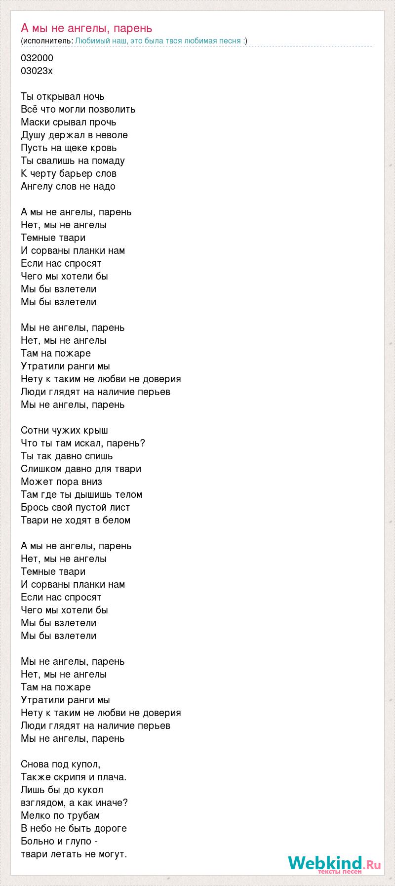032000 03023x Ты открывал ночь Всё что могли позволить Маски срывал прочь Душу держал в неволе Пусть на щеке кровь Ты свалишь на помаду К черту барьер слов Ангелу слов не надо А мы не ангелы, парень Нет, мы не ангелы Темные твари И сорваны планки нам Если нас спросят Чего мы хотели бы Мы бы взлетели Мы бы взлетели Мы не ангелы, парень Нет, мы не ангелы Там на пожаре Утратили ранги мы Нету к таким не любви не доверия Люди глядят на наличие перьев Мы не ангелы, парень Сотни чужих крыш Что ты там искал, парень? Ты так давно спишь Слишком давно для твари Может пора вниз Там где ты дышишь телом Брось свой пустой лист Твари не ходят в белом А мы не ангелы, парень Нет, мы не ангелы Темные твари И сорваны планки нам Если нас спросят Чего мы хотели бы Мы бы взлетели Мы бы взлетели Мы не ангелы, парень Нет, мы не ангелы Там на пожаре Утратили ранги мы Нету к таким не любви не доверия Люди глядят на наличие перьев Мы не ангелы, парень Снова под купол, Также скрипя и плача. Лишь бы до кукол взглядом, а как иначе? Мелко по трубам В небо не быть дороге Больно и глупо - твари летать не могут.