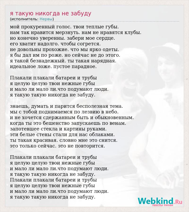 мой прокуренный голос. твои теплые губы. нам так нравится мерзнуть. нам не нравятся клубы. но конечно уверенны. забери мое сердце. его хватит надолго. чтобы согрется. не довольны прохожие. что мы ярко одеты. я бы дал им по роже. но сейчас не до этого. я такой безнадежный. ты такая нарядная. идеальное ложе. пустое парадное. Плакали плакали батареи и трубы я целую целую твои нежные губы и мало ли мало ли.что подумают люди. я такую такую никогда не забуду. знаешь, думать и парится бесполезная тема. мы с тобой поднимаемся по лезвию в небо. и не хочется сдержанным быть и обыкновенным. когда ты это бешенство запускаешь по венам. запотевшее стекла и картины руками. эти белые стены стали для нас облаками. ты такая красивая. словно мне это снится. это только сейчас. это не повторится. Плакали плакали батареи и трубы я целую целую твои нежные губы и мало ли мало ли.что подумают люди. я такую такую никогда не забуду. Плакали плакали батареи и трубы я целую целую твои нежные губы и мало ли мало ли.что подумают люди. я такую такую никогда не забуду.