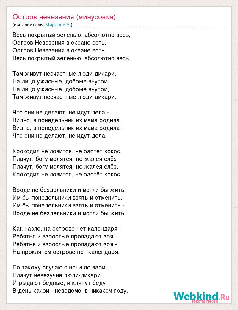 Весь покрытый зеленью, абсолютно весь, Остров Невезения в океане есть. Остров Невезения в океане есть, Весь покрытый зеленью, абсолютно весь. Там живут несчастные люди-дикари, На лицо ужасные, добрые внутри. На лицо ужасные, добрые внутри, Там живут несчастные люди-дикари. Что они не делают, не идут дела - Видно, в понедельник их мама родила. Видно, в понедельник их мама родила - Что они не делают, не идут дела. Крокодил не ловится, не растёт кокос. Плачут, богу молятся, не жалея слёз Плачут, богу молятся, не жалея слёз. Крокодил не ловится, не растёт кокос. Вроде не бездельники и могли бы жить - Им бы понедельники взять и отменить. Им бы понедельники взять и отменить - Вроде не бездельники и могли бы жить. Как назло, на острове нет календаря - Ребятня и взрослые пропадают зря. Ребятня и взрослые пропадают зря - На проклятом острове нет календаря. По такому случаю с ночи до зари Плачут невезучие люди-дикари. И рыдают бедные, и клянут беду В день какой - неведомо, в никаком году.