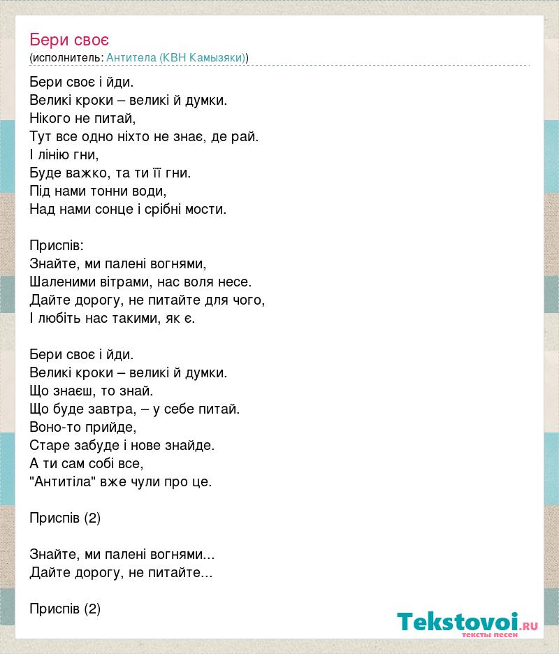 Бери своє і йди. Великі кроки – великі й думки. Нікого не питай, Тут все одно ніхто не знає, де рай. І лінію гни, Буде важко, та ти її гни. Під нами тонни води, Над нами сонце і срібні мости. Приспів: Знайте, ми палені вогнями, Шаленими вітрами, нас воля несе. Дайте дорогу, не питайте для чого, І любіть нас такими, як є. Бери своє і йди. Великі кроки – великі й думки. Що знаєш, то знай. Що буде завтра, – у себе питай. Воно-то прийде, Старе забуде і нове знайде. А ти сам собі все, "Антитіла" вже чули про це. Приспів (2) Знайте, ми палені вогнями... Дайте дорогу, не питайте... Приспів (2)