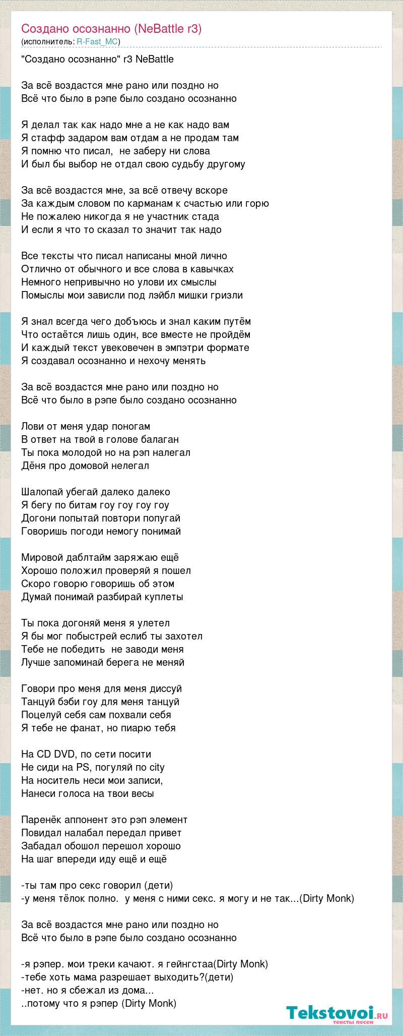 "Создано осознанно" r3 NeBattle За всё воздастся мне рано или поздно но Всё что было в рэпе было создано осознанно Я делал так как надо мне а не как надо вам Я стафф задаром вам отдам а не продам там Я помню что писал, не заберу ни слова И был бы выбор не отдал свою судьбу другому За всё воздастся мне, за всё отвечу вскоре За каждым словом по карманам к счастью или горю Не пожалею никогда я не участник стада И если я что то сказал то значит так надо Все тексты что писал написаны мной лично Отлично от обычного и все слова в кавычках Немного непривычно но улови их смыслы Помыслы мои зависли под лэйбл мишки гризли Я знал всегда чего добъюсь и знал каким путём Что остаётся лишь один, все вместе не пройдём И каждый текст увековечен в эмпэтри формате Я создавал осознанно и нехочу менять За всё воздастся мне рано или поздно но Всё что было в рэпе было создано осознанно Лови от меня удар поногам В ответ на твой в голове балаган Ты пока молодой но на рэп налегал Дёня про домовой нелегал Шалопай убегай далеко далеко Я бегу по битам гоу гоу гоу гоу Догони попытай повтори попугай Говоришь погоди немогу понимай Мировой даблтайм заряжаю ещё Хорошо положил проверяй я пошел Скоро говорю говоришь об этом Думай понимай разбирай куплеты Ты пока догоняй меня я улетел Я бы мог побыстрей еслиб ты захотел Тебе не победить не заводи меня Лучше запоминай берега не меняй Говори про меня для меня диссуй Танцуй бэби гоу для меня танцуй Поцелуй себя сам похвали себя Я тебе не фанат, но пиарю тебя На CD DVD, по сети посити Не сиди на PS, погуляй по city На носитель неси мои записи, Нанеси голоса на твои весы Паренёк аппонент это рэп элемент Повидал налабал передал привет Забадал обошол перешол хорошо На шаг впереди иду ещё и ещё -ты там про секс говорил (дети) -у меня тёлок полно. у меня с ними секс. я могу и не так...(Dirty Monk) За всё воздастся мне рано или поздно но Всё что было в рэпе было создано осознанно -я рэпер. мои треки качают. я гейнгстаа(Dirty Monk) -тебе хоть мама разрешает выходить?(дети) -нет. но я сбежал из дома... ..потому что я рэпер (Dirty Monk)