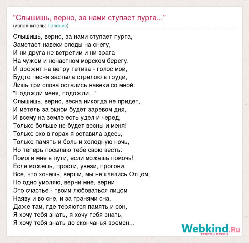 Слышишь, верно, за нами ступает пурга, Заметает навеки следы на снегу, И ни друга не встретим и ни врага На чужом и ненастном морском берегу. И дрожит на ветру тетива - голос мой, Будто песня застыла стрелою в груди, Лишь три слова остались навеки со мной: "Подожди меня, подожди..." Слышишь, верно, весна никогда не придет, И метель за окном будет заревом дня, И всему на земле есть удел и черед, Только больше не будет весны и меня! Только эхо в горах я оставила здесь, Только память и боль и холодную ночь, Но теперь посылаю тебе свою весть: Помоги мне в пути, если можешь помочь! Если можешь, прости, увези, прогони, Все, что хочешь, верши, мы не клялись Отцом, Но одно умоляю, верни мне, верни Это счастье - твоим любоваться лицом Наяву и во сне, и за гранями сна, Даже там, где теряются память и сон, Я хочу тебя знать, я хочу тебя знать, Я хочу тебя знать до скончанья времен...