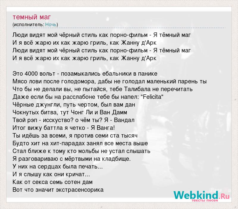 Люди видят мой чёрный стиль как порно-фильм - Я тёмный маг И я всё жарю их как жарю гриль, как Жанну д'Арк Люди видят мой чёрный стиль как порно-фильм - Я тёмный маг И я всё жарю их как жарю гриль, как Жанну д'Арк Это 4000 вольт - позамыкались ебальники в панике Мясо лови после голодомора, дабы не голодал маленький парень ты Что бы не делали вы, не пытайся, тебе Талибала не перечитать Даже если бы на расслабоне тебе бы напел: "Felicita" Чёрные джунгли, путь чертом, был вам дан Чокнутых битва, тут Чонг Ли и Ван Дамм Твой рэп - исскуство? о чём ты? Я - Вандал Итог вижу баттла я четко - Я Ванга! Ты идёшь за всеми, я против семи ста тысяч Будто хит на хит-парадах занял все места выше Стал ближе к тому кто мольбы не устал слышать Я разговариваю с мёртвыми на кладбище. У них на сердцах была печать... И я слышу как они кричат... Как от секса семь сотен дам Вот что значит экстрасенсорика
