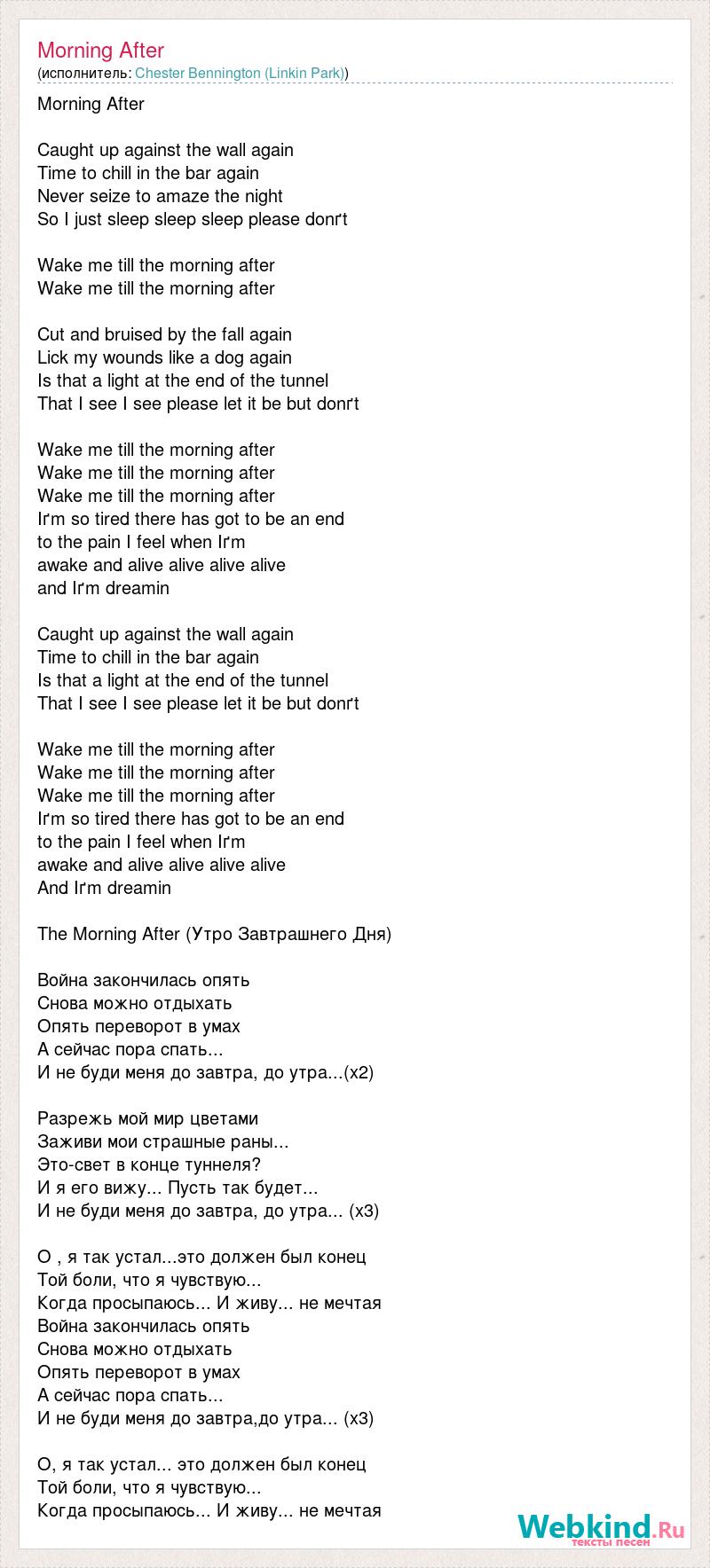 Morning After Caught up against the wall again Time to chill in the bar again Never seize to amaze the night So I just sleep sleep sleep please donґt Wake me till the morning after Wake me till the morning after Cut and bruised by the fall again Lick my wounds like a dog again Is that a light at the end of the tunnel That I see I see please let it be but donґt Wake me till the morning after Wake me till the morning after Wake me till the morning after Iґm so tired there has got to be an end to the pain I feel when Iґm awake and alive alive alive alive and Iґm dreamin Caught up against the wall again Time to chill in the bar again Is that a light at the end of the tunnel That I see I see please let it be but donґt Wake me till the morning after Wake me till the morning after Wake me till the morning after Iґm so tired there has got to be an end to the pain I feel when Iґm awake and alive alive alive alive And Iґm dreamin The Morning After (Утро Завтрашнего Дня) Война закончилась опять Снова можно отдыхать Опять переворот в умах А сейчас пора спать... И не буди меня до завтра, до утра...(х2) Разрежь мой мир цветами Заживи мои страшные раны... Это-свет в конце туннеля? И я его вижу... Пусть так будет... И не буди меня до завтра, до утра... (х3) О , я так устал...это должен был конец Той боли, что я чувствую... Когда просыпаюсь... И живу... не мечтая Война закончилась опять Снова можно отдыхать Опять переворот в умах А сейчас пора спать... И не буди меня до завтра,до утра... (х3) О, я так устал... это должен был конец Той боли, что я чувствую... Когда просыпаюсь... И живу... не мечтая