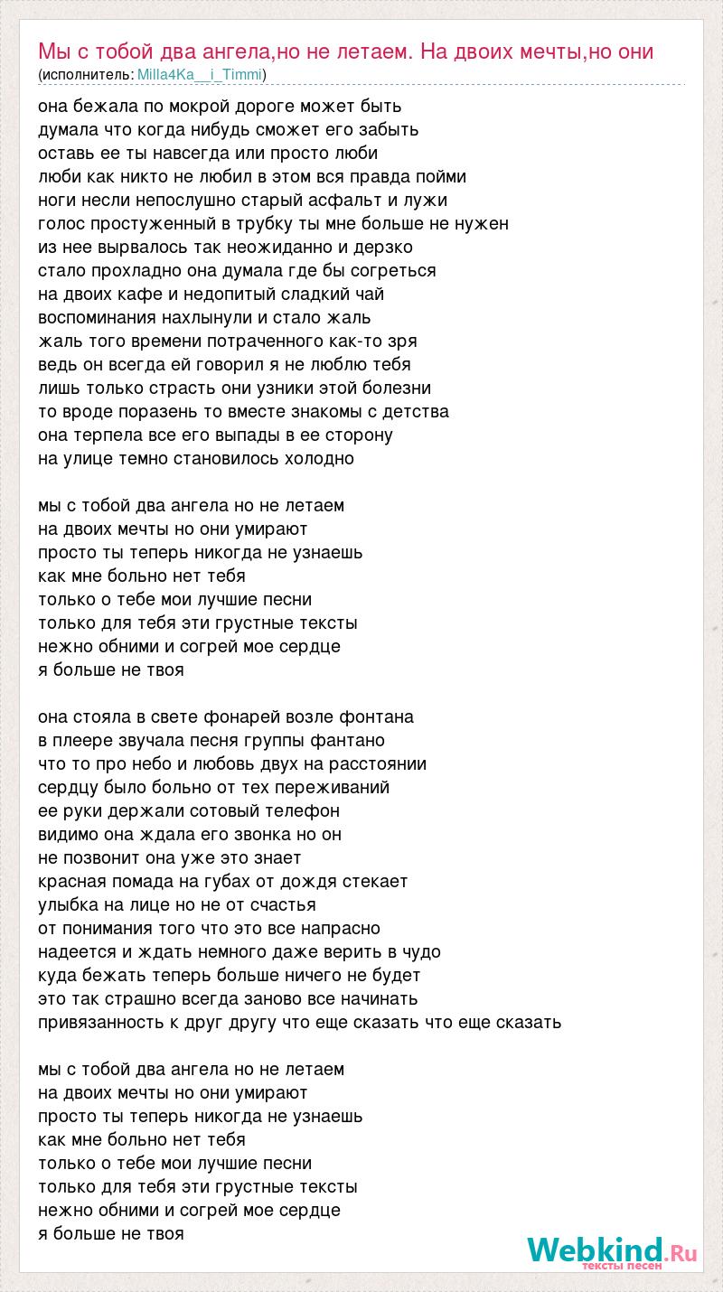 она бежала по мокрой дороге может быть думала что когда нибудь сможет его забыть оставь ее ты навсегда или просто люби люби как никто не любил в этом вся правда пойми ноги несли непослушно старый асфальт и лужи голос простуженный в трубку ты мне больше не нужен из нее вырвалось так неожиданно и дерзко стало прохладно она думала где бы согреться на двоих кафе и недопитый сладкий чай воспоминания нахлынули и стало жаль жаль того времени потраченного как-то зря ведь он всегда ей говорил я не люблю тебя лишь только страсть они узники этой болезни то вроде поразень то вместе знакомы с детства она терпела все его выпады в ее сторону на улице темно становилось холодно мы с тобой два ангела но не летаем на двоих мечты но они умирают просто ты теперь никогда не узнаешь как мне больно нет тебя только о тебе мои лучшие песни только для тебя эти грустные тексты нежно обними и согрей мое сердце я больше не твоя она стояла в свете фонарей возле фонтана в плеере звучала песня группы фантано что то про небо и любовь двух на расстоянии сердцу было больно от тех переживаний ее руки держали сотовый телефон видимо она ждала его звонка но он не позвонит она уже это знает красная помада на губах от дождя стекает улыбка на лице но не от счастья от понимания того что это все напрасно надеется и ждать немного даже верить в чудо куда бежать теперь больше ничего не будет это так страшно всегда заново все начинать привязанность к друг другу что еще сказать что еще сказать мы с тобой два ангела но не летаем на двоих мечты но они умирают просто ты теперь никогда не узнаешь как мне больно нет тебя только о тебе мои лучшие песни только для тебя эти грустные тексты нежно обними и согрей мое сердце я больше не твоя