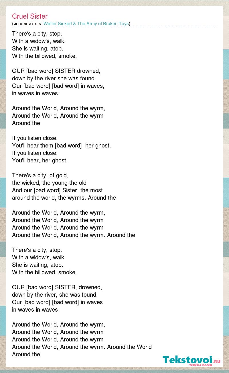 There's a city, stop. With a widow’s, walk. She is waiting, atop. With the billowed, smoke. OUR CRUEL SISTER drowned, down by the river she was found. Our Cruel Sister comes in waves, in waves in waves Around the World, Around the wyrm, Around the World, Around the wyrm Around the If you listen close. You'll hear them welcome, her ghost. If you listen close. You'll hear, her ghost. There's a city, of gold, the wicked, the young the old And our Cruel Sister, the most around the world, the wyrms. Around the Around the World, Around the wyrm, Around the World, Around the wyrm Around the World, Around the wyrm Around the World, Around the wyrm. Around the There's a city, stop. With a widow’s, walk. She is waiting, atop. With the billowed, smoke. OUR CRUEL SISTER, drowned, down by the river, she was found, Our Cruel Sister comes in waves in waves in waves Around the World, Around the wyrm, Around the World, Around the wyrm Around the World, Around the wyrm Around the World, Around the wyrm. Around the World Around the