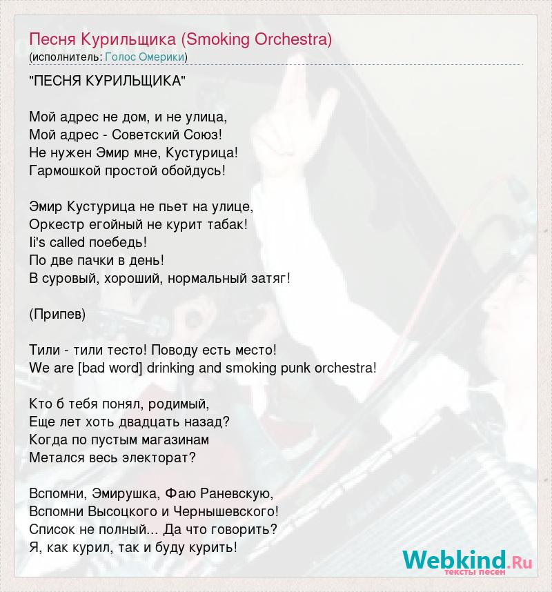 "ПЕСНЯ КУРИЛЬЩИКА" Мой адрес не дом, и не улица, Мой адрес - Советский Союз! Не нужен Эмир мне, Кустурица! Гармошкой простой обойдусь! Эмир Кустурица не пьет на улице, Оркестр егойный не курит табак! Ii's called поебедь! По две пачки в день! В суровый, хороший, нормальный затяг! (Припев) Тили - тили тесто! Поводу есть место! We are [bad word] drinking and smoking punk orchestra! Кто б тебя понял, родимый, Еще лет хоть двадцать назад? Когда по пустым магазинам Метался весь электорат? Вспомни, Эмирушка, Фаю Раневскую, Вспомни Высоцкого и Чернышевского! Список не полный... Да что говорить? Я, как курил, так и буду курить!