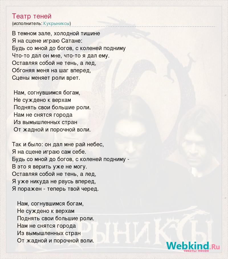 В темном зале, холодной тишине Я на сцене играю Сатане: Будь со мной до богов, с коленей подниму Что-то дал он мне, что-то я дал ему. Оставляя собой не тень, а лед, Обгоняя меня на шаг вперед, Сцены меняет роли врет. Нам, согнувшимся богам, Не суждено к верхам Поднять свои большие роли. Нам не снятся города Из вымышленных стран От жадной и порочной воли. Так и было: он дал мне рай небес, Я на сцене играю сам себе. Будь со мной до богов, с коленей подниму - В это я верить уже не могу. Оставляя собой не тень, а лед, Я уже никуда не рвусь вперед, Я поражен - теперь твой черед. Нам, согнувшимся богам, Не суждено к верхам Поднять свои большие роли. Нам не снятся города Из вымышленных стран От жадной и порочной воли.