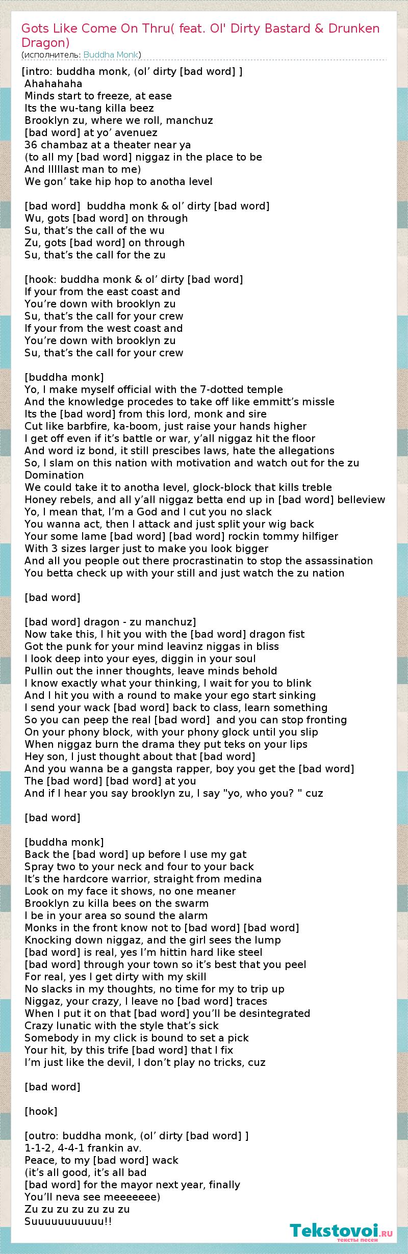 [intro: buddha monk, (ol’ dirty [bad word] ] Ahahahaha Minds start to freeze, at ease Its the wu-tang killa beez Brooklyn zu, where we roll, manchuz Comin at yo’ avenuez 36 chambaz at a theater near ya (to all my [bad word] niggaz in the place to be And lllllast man to me) We gon’ take hip hop to anotha level [chorus: buddha monk & ol’ dirty [bad word] Wu, gots like come on through Su, that’s the call of the wu Zu, gots like come on through Su, that’s the call for the zu [hook: buddha monk & ol’ dirty [bad word] If your from the east coast and You’re down with brooklyn zu Su, that’s the call for your crew If your from the west coast and You’re down with brooklyn zu Su, that’s the call for your crew [buddha monk] Yo, I make myself official with the 7-dotted temple And the knowledge procedes to take off like emmitt’s missle Its the rapfire comin from this lord, monk and sire Cut like barbfire, ka-boom, just raise your hands higher I get off even if it’s battle or war, y’all niggaz hit the floor And word iz bond, it still prescibes laws, hate the allegations So, I slam on this nation with motivation and watch out for the zu Domination We could take it to anotha level, glock-block that kills treble Honey rebels, and all y’all niggaz betta end up in [bad word] belleview Yo, I mean that, I’m a God and I cut you no slack You wanna act, then I attack and just split your wig back Your some lame [bad word] [bad word] rockin tommy hilfiger With 3 sizes larger just to make you look bigger And all you people out there procrastinatin to stop the assassination You betta check up with your still and just watch the zu nation [chorus] [drunken dragon - zu manchuz] Now take this, I hit you with the drunken dragon fist Got the punk for your mind leavinz niggas in bliss I look deep into your eyes, diggin in your soul Pullin out the inner thoughts, leave minds behold I know exactly what your thinking, I wait for you to blink And I hit you with a round to make your ego start sinking I send your wack [bad word] back to class, learn something So you can peep the real [bad word] and you can stop fronting On your phony block, with your phony glock until you slip When niggaz burn the drama they put teks on your lips Hey son, I just thought about that [bad word] And you wanna be a gangsta rapper, boy you get the [bad word] The drunken dragon, comin at you And if I hear you say brooklyn zu, I say "yo, who you? " cuz [chorus] [buddha monk] Back the [bad word] up before I use my gat Spray two to your neck and four to your back It’s the hardcore warrior, straight from medina Look on my face it shows, no one meaner Brooklyn zu killa bees on the swarm I be in your area so sound the alarm Monks in the front know not to [bad word] drunk Knocking down niggaz, and the girl sees the lump [bad word] is real, yes I’m hittin hard like steel I’m comin through your town so it’s best that you peel For real, yes I get dirty with my skill No slacks in my thoughts, no time for my to trip up Niggaz, your crazy, I leave no [bad word] traces When I put it on that [bad word] you’ll be desintegrated Crazy lunatic with the style that’s sick Somebody in my click is bound to set a pick Your hit, by this trife [bad word] that I fix I’m just like the devil, I don’t play no tricks, cuz [chorus] [hook] [outro: buddha monk, (ol’ dirty [bad word] ] 1-1-2, 4-4-1 frankin av. Peace, to my [bad word] wack (it’s all good, it’s all bad Dirty runs for the mayor next year, finally You’ll neva see meeeeeee) Zu zu zu zu zu zu zu Suuuuuuuuuuu!!