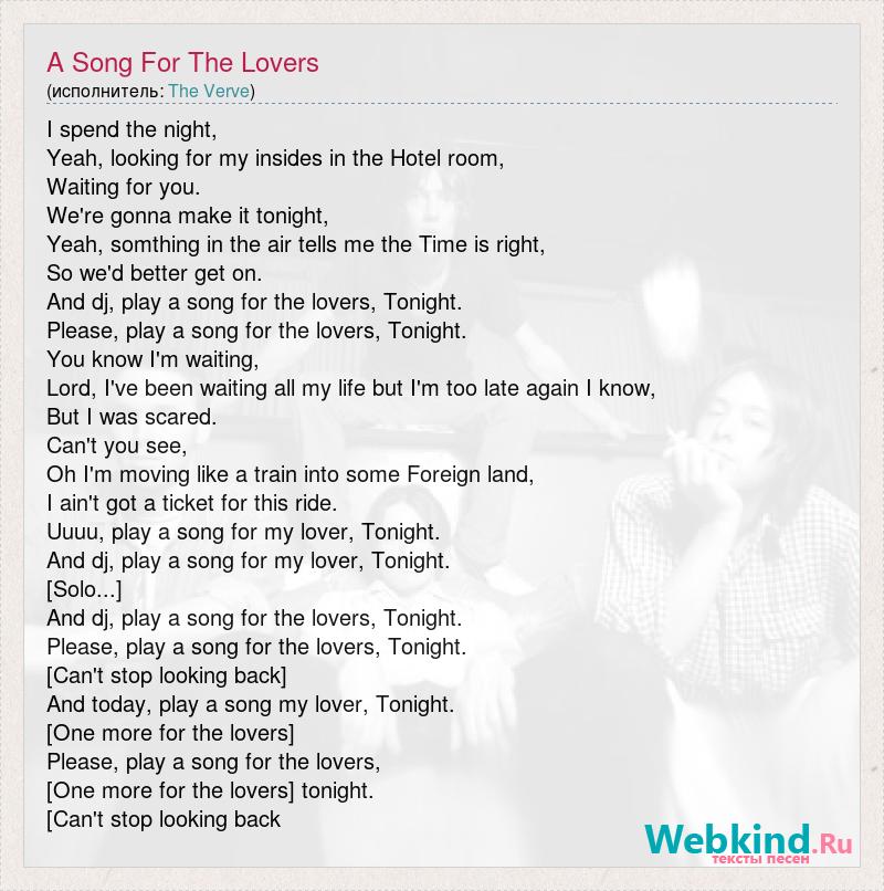 I spend the night, Yeah, looking for my insides in the Hotel room, Waiting for you. We're gonna make it tonight, Yeah, somthing in the air tells me the Time is right, So we'd better get on. And dj, play a song for the lovers, Tonight. Please, play a song for the lovers, Tonight. You know I'm waiting, Lord, I've been waiting all my life but I'm too late again I know, But I was scared. Can't you see, Oh I'm moving like a train into some Foreign land, I ain't got a ticket for this ride. Uuuu, play a song for my lover, Tonight. And dj, play a song for my lover, Tonight. [Solo...] And dj, play a song for the lovers, Tonight. Please, play a song for the lovers, Tonight. [Can't stop looking back] And today, play a song my lover, Tonight. [One more for the lovers] Please, play a song for the lovers, [One more for the lovers] tonight. [Can't stop looking back