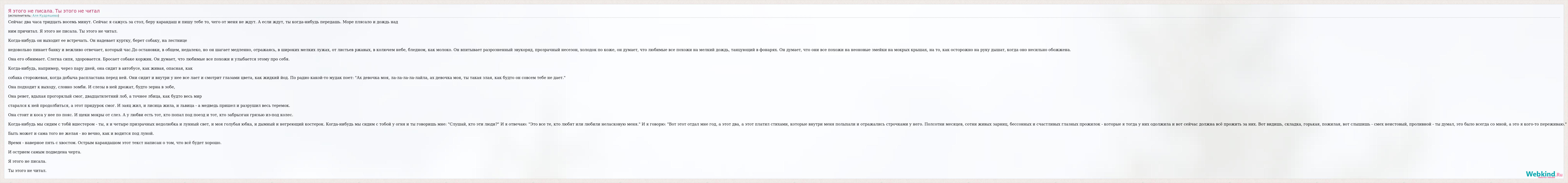 Сейчас два часа тридцать восемь минут. Сейчас я сажусь за стол, беру карандаш и пишу тебе то, чего от меня не ждут. А если ждут, ты когда-нибудь передашь. Море плясало и дождь над ним причитал. Я этого не писала. Ты этого не читал. Когда-нибудь он выходит ее встречать. Он надевает куртку, берет собаку, на лестнице недовольно пинает банку и вежливо отвечает, который час.До остановки, в общем, недалеко, но он шагает медленно, отражаясь, в широких мелких лужах, от листьев ржавых, в колючем небе, бледном, как молоко. Он впитывает разрозненный звукоряд, прозрачный несезон, холодок по коже, он думает, что любимые все похожи на мелкий дождь, танцующий в фонарях. Он думает, что они все похожи на неоновые змейки на мокрых крышах, на то, как осторожно на руку дышат, когда оно несильно обожжена. Она его обнимает. Слегка сипя, здоровается. Бросает собаке коржик. Он думает, что любимые все похожи и улыбается этому про себя. Когда-нибудь, например, через пару дней, она сидит в автобусе, как живая, опасная, как собака сторожевая, когда добыча распластана перед ней. Они сидит и внутри у нее все лает и смотрит глазами цвета, как жидкий йод. По радио какой-то мудак поет: "Ах девочка моя, ла-ла-ла-ла-лайла, ах девочка моя, ты такая злая, как будто он совсем тебе не дает." Она подходит к выходу, словно зомби. И слезы в ней дрожат, будто зерна в зобе, Она ревет, вдыхая прогорклый смог, двадцатилетний лоб, а точнее лбица, как будто весь мир старался к ней продолбиться, а этот придурок смог. И заяц жил, и лисица жила, и львица - а медведь пришел и разрушил весь теремок. Она стоит и коса у нее по пояс. И щеки мокры от слез. А у любви есть тот, кто попал под поезд и тот, кто забрызган грязью из-под колес. Когда-нибудь мы сидим с тобй вшестером - ты, я и четыре призрачных недолюбка и лунный свет, и моя голубая юбка, и дымный и негреющий костерок. Когда-нибудь мы сидим с тобой у огня и ты говоришь мне: "Слушай, кто эти люди?" И я отвечаю: "Это все те, кто любят или любили неласковую меня." И я говорю: "Вот этот отдал мне год, а этот два, а этот платил стихами, которые внутри меня полыхали и отражались строчками у него. Полсотни месяцев, сотни живых зарниц, бессонных и счастливых глазных прожилок - которые я тогда у них одолжила и вот сейчас должна всё прожить за них. Вот видишь, складка, горькая, пожилая, вот слышишь - смех неистовый, проливной - ты думал, это было всегда со мной, а это я кого-то переживаю." Быть может и сама того не желая - но вечно, как и водится под луной. Время - наверное пять с хвостом. Острым карандашом этот текст написан о том, что всё будет хорошо. И острием самым подведена черта. Я этого не писала. Ты этого не читал.