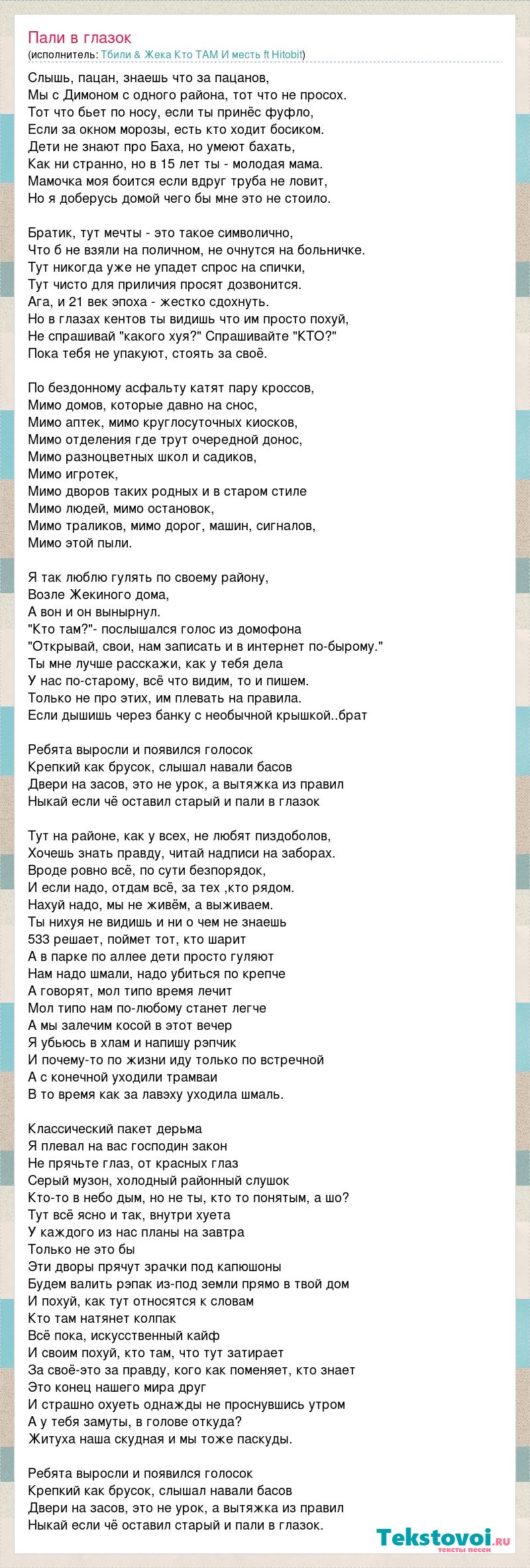 Слышь, пацан, знаешь что за пацанов, Мы с Димоном с одного района, тот что не просох. Тот что бьет по носу, если ты принёс фуфло, Если за окном морозы, есть кто ходит босиком. Дети не знают про Баха, но умеют бахать, Как ни странно, но в 15 лет ты - молодая мама. Мамочка моя боится если вдруг труба не ловит, Но я доберусь домой чего бы мне это не стоило. Братик, тут мечты - это такое символично, Что б не взяли на поличном, не очнутся на больничке. Тут никогда уже не упадет спрос на спички, Тут чисто для приличия просят дозвонится. Ага, и 21 век эпоха - жестко сдохнуть. Но в глазах кентов ты видишь что им просто похуй, Не спрашивай "какого хуя?" Спрашивайте "КТО?" Пока тебя не упакуют, стоять за своё. По бездонному асфальту катят пару кроссов, Мимо домов, которые давно на снос, Мимо аптек, мимо круглосуточных киосков, Мимо отделения где трут очередной донос, Мимо разноцветных школ и садиков, Мимо игротек, Мимо дворов таких родных и в старом стиле Мимо людей, мимо остановок, Мимо траликов, мимо дорог, машин, сигналов, Мимо этой пыли. Я так люблю гулять по своему району, Возле Жекиного дома, А вон и он вынырнул. "Кто там?"- послышался голос из домофона "Открывай, свои, нам записать и в интернет по-бырому." Ты мне лучше расскажи, как у тебя дела У нас по-старому, всё что видим, то и пишем. Только не про этих, им плевать на правила. Если дышишь через банку с необычной крышкой..брат Ребята выросли и появился голосок Крепкий как брусок, слышал навали басов Двери на засов, это не урок, а вытяжка из правил Ныкай если чё оставил старый и пали в глазок Тут на районе, как у всех, не любят пиздоболов, Хочешь знать правду, читай надписи на заборах. Вроде ровно всё, по сути безпорядок, И если надо, отдам всё, за тех ,кто рядом. Нахуй надо, мы не живём, а выживаем. Ты нихуя не видишь и ни о чем не знаешь 533 решает, поймет тот, кто шарит А в парке по аллее дети просто гуляют Нам надо шмали, надо убиться по крепче А говорят, мол типо время лечит Мол типо нам по-любому станет легче А мы залечим косой в этот вечер Я убьюсь в хлам и напишу рэпчик И почему-то по жизни иду только по встречной А с конечной уходили трамваи В то время как за лавэху уходила шмаль. Классический пакет дерьма Я плевал на вас господин закон Не прячьте глаз, от красных глаз Серый музон, холодный районный слушок Кто-то в небо дым, но не ты, кто то понятым, а шо? Тут всё ясно и так, внутри хуета У каждого из нас планы на завтра Только не это бы Эти дворы прячут зрачки под капюшоны Будем валить рэпак из-под земли прямо в твой дом И похуй, как тут относятся к словам Кто там натянет колпак Всё пока, искусственный кайф И своим похуй, кто там, что тут затирает За своё-это за правду, кого как поменяет, кто знает Это конец нашего мира друг И страшно охуеть однажды не проснувшись утром А у тебя замуты, в голове откуда? Житуха наша скудная и мы тоже паскуды. Ребята выросли и появился голосок Крепкий как брусок, слышал навали басов Двери на засов, это не урок, а вытяжка из правил Ныкай если чё оставил старый и пали в глазок.
