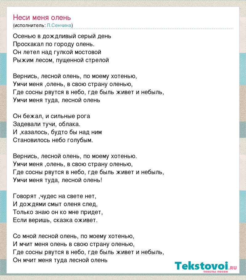 Осенью в дождливый серый день Проскакал по городу олень. Он летел над гулкой мостовой Рыжим лесом, пущенной стрелой Вернись, лесной олень, по моему хотенью, Умчи меня ,олень, в свою страну оленью, Где сосны рвутся в небо, где быль живет и небыль, Умчи меня туда, лесной олень Он бежал, и сильные рога Задевали тучи, облака. И ,казалось, будто бы над ним Становилось небо голубым. Вернись, лесной олень, по моему хотенью. Умчи меня ,олень, в свою страну оленью, Где сосны рвутся в небо, где быль живет и небыль, Умчи меня туда, лесной олень! Говорят ,чудес на свете нет, И дождями смыт оленя след, Только знаю он ко мне придет, Если веришь, сказка оживет. Со мной лесной олень, по моему хотенью, И мчит меня олень в свою страну оленью, Где сосны рвутся в небо, где быль живет и небыль, Он мчит меня туда леcной олень