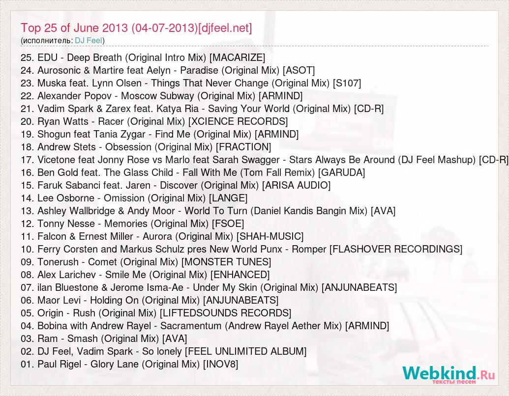 25. EDU - Deep Breath (Original Intro Mix) [MACARIZE] 24. Aurosonic & Martire feat Aelyn - Paradise (Original Mix) [ASOT] 23. Muska feat. Lynn Olsen - Things That Never Change (Original Mix) [S107] 22. Alexander Popov - Moscow Subway (Original Mix) [ARMIND] 21. Vadim Spark & Zarex feat. Katya Ria - Saving Your World (Original Mix) [CD-R] 20. Ryan Watts - Racer (Original Mix) [XCIENCE RECORDS] 19. Shogun feat Tania Zygar - Find Me (Original Mix) [ARMIND] 18. Andrew Stets - Obsession (Original Mix) [FRACTION] 17. Vicetone feat Jonny Rose vs Marlo feat Sarah Swagger - Stars Always Be Around (DJ Feel Mashup) [CD-R] 16. Ben Gold feat. The Glass Child - Fall With Me (Tom Fall Remix) [GARUDA] 15. Faruk Sabanci feat. Jaren - Discover (Original Mix) [ARISA AUDIO] 14. Lee Osborne - Omission (Original Mix) [LANGE] 13. Ashley Wallbridge & Andy Moor - World To Turn (Daniel Kandis Bangin Mix) [AVA] 12. Tonny Nesse - Memories (Original Mix) [FSOE] 11. Falcon & Ernest Miller - Aurora (Original Mix) [SHAH-MUSIC] 10. Ferry Corsten and Markus Schulz pres New World Punx - Romper [FLASHOVER RECORDINGS] 09. Tonerush - Comet (Original Mix) [MONSTER TUNES] 08. Alex Larichev - Smile Me (Original Mix) [ENHANCED] 07. ilan Bluestone & Jerome Isma-Ae - Under My Skin (Original Mix) [ANJUNABEATS] 06. Maor Levi - Holding On (Original Mix) [ANJUNABEATS] 05. Origin - Rush (Original Mix) [LIFTEDSOUNDS RECORDS] 04. Bobina with Andrew Rayel - Sacramentum (Andrew Rayel Aether Mix) [ARMIND] 03. Ram - Smash (Original Mix) [AVA] 02. DJ Feel, Vadim Spark - So lonely [FEEL UNLIMITED ALBUM] 01. Paul Rigel - Glory Lane (Original Mix) [INOV8]