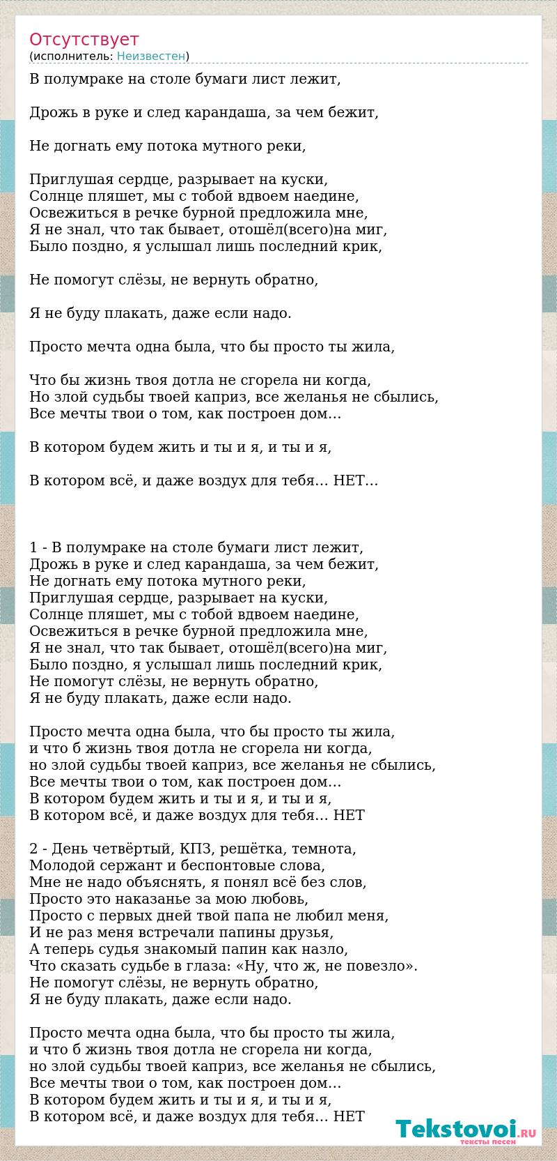 В полумраке на столе бумаги лист лежит, Дрожь в руке и след карандаша, за чем бежит, Не догнать ему потока мутного реки, Приглушая сердце, разрывает на куски, Солнце пляшет, мы с тобой вдвоем наедине, Освежиться в речке бурной предложила мне, Я не знал, что так бывает, отошёл(всего)на миг, Было поздно, я услышал лишь последний крик, Не помогут слёзы, не вернуть обратно, Я не буду плакать, даже если надо. Просто мечта одна была, что бы просто ты жила, Что бы жизнь твоя дотла не сгорела ни когда, Но злой судьбы твоей каприз, все желанья не сбылись, Все мечты твои о том, как построен дом… В котором будем жить и ты и я, и ты и я, В котором всё, и даже воздух для тебя… НЕТ… 1 - В полумраке на столе бумаги лист лежит, Дрожь в руке и след карандаша, за чем бежит, Не догнать ему потока мутного реки, Приглушая сердце, разрывает на куски, Солнце пляшет, мы с тобой вдвоем наедине, Освежиться в речке бурной предложила мне, Я не знал, что так бывает, отошёл(всего)на миг, Было поздно, я услышал лишь последний крик, Не помогут слёзы, не вернуть обратно, Я не буду плакать, даже если надо. Просто мечта одна была, что бы просто ты жила, и что б жизнь твоя дотла не сгорела ни когда, но злой судьбы твоей каприз, все желанья не сбылись, Все мечты твои о том, как построен дом… В котором будем жить и ты и я, и ты и я, В котором всё, и даже воздух для тебя… НЕТ 2 - День четвёртый, КПЗ, решётка, темнота, Молодой сержант и беспонтовые слова, Мне не надо объяснять, я понял всё без слов, Просто это наказанье за мою любовь, Просто с первых дней твой папа не любил меня, И не раз меня встречали папины друзья, А теперь судья знакомый папин как назло, Что сказать судьбе в глаза: «Ну, что ж, не повезло». Не помогут слёзы, не вернуть обратно, Я не буду плакать, даже если надо. Просто мечта одна была, что бы просто ты жила, и что б жизнь твоя дотла не сгорела ни когда, но злой судьбы твоей каприз, все желанья не сбылись, Все мечты твои о том, как построен дом… В котором будем жить и ты и я, и ты и я, В котором всё, и даже воздух для тебя… НЕТ