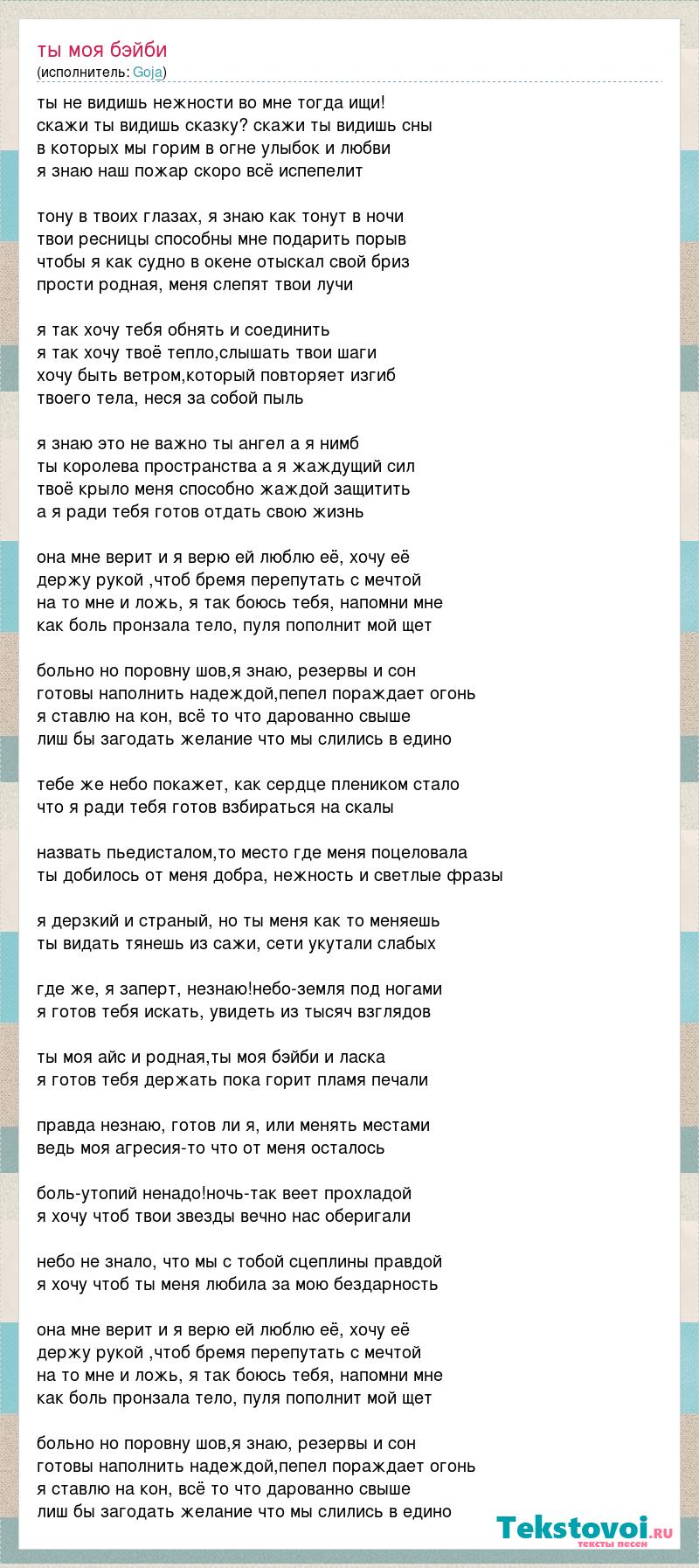 ты не видишь нежности во мне тогда ищи! скажи ты видишь сказку? скажи ты видишь сны в которых мы горим в огне улыбок и любви я знаю наш пожар скоро всё испепелит тону в твоих глазах, я знаю как тонут в ночи твои ресницы способны мне подарить порыв чтобы я как судно в окене отыскал свой бриз прости родная, меня слепят твои лучи я так хочу тебя обнять и соединить я так хочу твоё тепло,слышать твои шаги хочу быть ветром,который повторяет изгиб твоего тела, неся за собой пыль я знаю это не важно ты ангел а я нимб ты королева пространства а я жаждущий сил твоё крыло меня способно жаждой защитить а я ради тебя готов отдать свою жизнь она мне верит и я верю ей люблю её, хочу её держу рукой ,чтоб бремя перепутать с мечтой на то мне и ложь, я так боюсь тебя, напомни мне как боль пронзала тело, пуля пополнит мой щет больно но поровну шов,я знаю, резервы и сон готовы наполнить надеждой,пепел пораждает огонь я ставлю на кон, всё то что дарованно свыше лиш бы загодать желание что мы слились в едино тебе же небо покажет, как сердце плеником стало что я ради тебя готов взбираться на скалы назвать пьедисталом,то место где меня поцеловала ты добилось от меня добра, нежность и светлые фразы я дерзкий и страный, но ты меня как то меняешь ты видать тянешь из сажи, сети укутали слабых где же, я заперт, незнаю!небо-земля под ногами я готов тебя искать, увидеть из тысяч взглядов ты моя айс и родная,ты моя бэйби и ласка я готов тебя держать пока горит пламя печали правда незнаю, готов ли я, или менять местами ведь моя агресия-то что от меня осталось боль-утопий ненадо!ночь-так веет прохладой я хочу чтоб твои звезды вечно нас оберигали небо не знало, что мы с тобой сцеплины правдой я хочу чтоб ты меня любила за мою бездарность она мне верит и я верю ей люблю её, хочу её держу рукой ,чтоб бремя перепутать с мечтой на то мне и ложь, я так боюсь тебя, напомни мне как боль пронзала тело, пуля пополнит мой щет больно но поровну шов,я знаю, резервы и сон готовы наполнить надеждой,пепел пораждает огонь я ставлю на кон, всё то что дарованно свыше лиш бы загодать желание что мы слились в едино
