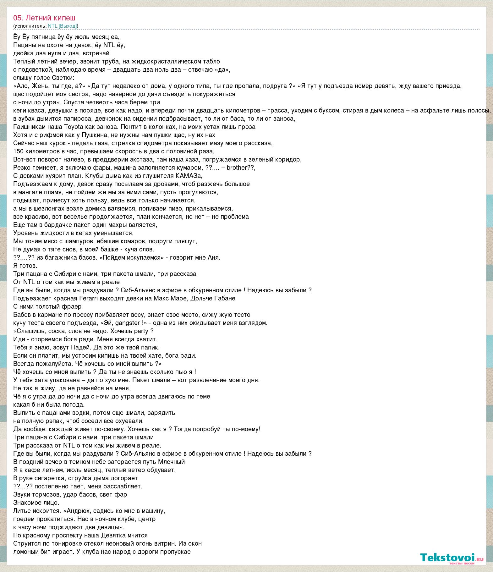 Ёу Ёу пятница ёу ёу июль месяц еа, Пацаны на охоте на девок, ёу NTL ёу, двойка два нуля и два, встречай. Теплый летний вечер, звонит труба, на жидкокристаллическом табло с подсветкой, наблюдаю время – двадцать два ноль два – отвечаю «да», слышу голос Светки: «Ало, Жень, ты где, а?» «Да тут недалеко от дома, у одного типа, ты где пропала, подруга ?» «Я тут у подъезда номер девять, жду вашего приезда, щас подойдет моя сестра, надо наверное до дачи съездить покуражиться с ночи до утра». Спустя четверть часа берем три кеги кваса, девушки в поряде, все как надо, и впереди почти двадцать километров – трасса, уходим с буксом, стирая в дым колеса – на асфальте лишь полосы, в зубах дымится папироса, девчонок на сидении подбрасывает, то ли от баса, то ли от заноса, Гаишникам наша Toyota как заноза. Понтит в колонках, на моих устах лишь проза Хотя и с рифмой как у Пушкина, не нужны нам пушки щас, ну их нах Сейчас наш курок - педаль газа, стрелка спидометра показывает мазу моего рассказа, 150 километров в час, превышаем скорость в два с половиной раза, Вот-вот поворот налево, в преддверии экстаза, там наша хаза, погружаемся в зеленый коридор, Резко темнеет, я включаю фары, машина заполняется кумаром, ??.... – brother??, С девками хуярит план. Клубы дыма как из глушителя КАМАЗа, Подъезжаем к дому, девок сразу посылаем за дровами, чтоб разжечь большое в мангале пламя, не пойдем же мы за ними сами, пусть прогуляются, подышат, принесут хоть пользу, ведь все только начинается, а мы в шезлонгах возле домика валяемся, попиваем пиво, прикалываемся, все красиво, вот веселье продолжается, план кончается, но нет – не проблема Еще там в бардачке пакет один махры валяется, Уровень жидкости в кегах уменьшается, Мы точим мясо с шампуров, ебашим комаров, подруги пляшут, Не думая о тяге снов, в моей башке - куча слов. ??....?? из багажника басов. «Пойдем искупаемся» - говорит мне Аня. Я готов. Три пацана с Сибири с нами, три пакета шмали, три рассказа От NTL о том как мы живем в реале Где вы были, когда мы раздували ? Сиб-Альянс в эфире в обкуренном стиле ! Надеюсь вы забыли ? Подъезжает красная Ferarri выходят девки на Макс Маре, Дольче Габане С ними толстый фраер Бабов в кармане по прессу прибавляет весу, знает свое место, сижу жую тесто кучу теста своего подъезда, «Эй, gangster !» - одна из них окидывает меня взглядом. «Слышишь, соска, слов не надо. Хочешь party ? Иди - оторвемся бога ради. Меня всегда хватит. Тебя я знаю, зовут Надей. Да это же твой папик. Если он платит, мы устроим кипишь на твоей хате, бога ради. Всегда пожалуйста. Чё хочешь со мной выпить ?» Чё хочешь со мной выпить ? Да ты не знаешь сколько пью я ! У тебя хата упакована – да по хую мне. Пакет шмали – вот развлечение моего дня. Не так я живу, да не равняйся на меня. Чё я с утра да до ночи да с ночи до утра всегда двигаюсь по теме какая б ни была погода. Выпить с пацанами водки, потом еще шмали, зарядить на полную рэпак, чтоб соседи все охуевали. Да вообще: каждый живет по-своему. Хочешь как я ? Тогда попробуй ты по-моему! Три пацана с Сибири с нами, три пакета шмали Три рассказа от NTL о том как мы живем в реале. Где вы были, когда мы раздували ? Сиб-Альянс в эфире в обкуренном стиле ! Надеюсь вы забыли ? В поздний вечер в темном небе загорается путь Млечный Я в кафе летнем, июль месяц, теплый ветер обдувает. В руке сигаретка, струйка дыма догорает ??...?? постепенно тает, меня расслабляет