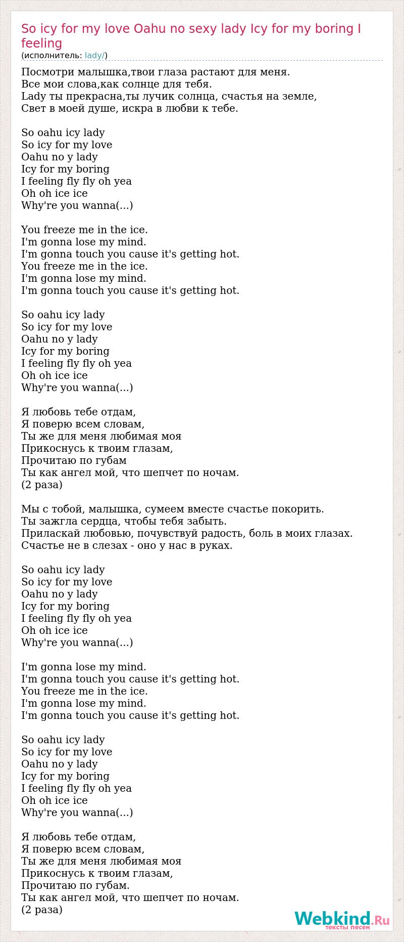 Посмотри малышка,твои глаза растают для меня. Все мои слова,как солнце для тебя. Lady ты прекрасна,ты лучик солнца, счастья на земле, Свет в моей душе, искра в любви к тебе. So оahu icy lady So icy for my love Oahu no y lady Icy for my boring I feeling fly fly oh yea Oh oh ice ice Why're you wanna(...) You freeze me in the ice. I'm gonna lose my mind. I'm gonna touch you cause it's getting hot. You freeze me in the ice. I'm gonna lose my mind. I'm gonna touch you cause it's getting hot. So оahu icy lady So icy for my love Oahu no y lady Icy for my boring I feeling fly fly oh yea Oh oh ice ice Why're you wanna(...) Я любовь тебе отдам, Я поверю всем словам, Ты же для меня любимая моя Прикоснусь к твоим глазам, Прочитаю по губам Ты как ангел мой, что шепчет по ночам. (2 раза) Мы с тобой, малышка, сумеем вместе счастье покорить. Ты зажгла сердца, чтобы тебя забыть. Приласкай любовью, почувствуй радость, боль в моих глазах. Счастье не в слезах - оно у нас в руках. So оahu icy lady So icy for my love Oahu no y lady Icy for my boring I feeling fly fly oh yea Oh oh ice ice Why're you wanna(...) I'm gonna lose my mind. I'm gonna touch you cause it's getting hot. You freeze me in the ice. I'm gonna lose my mind. I'm gonna touch you cause it's getting hot. So оahu icy lady So icy for my love Oahu no y lady Icy for my boring I feeling fly fly oh yea Oh oh ice ice Why're you wanna(...) Я любовь тебе отдам, Я поверю всем словам, Ты же для меня любимая моя Прикоснусь к твоим глазам, Прочитаю по губам. Ты как ангел мой, что шепчет по ночам. (2 раза)