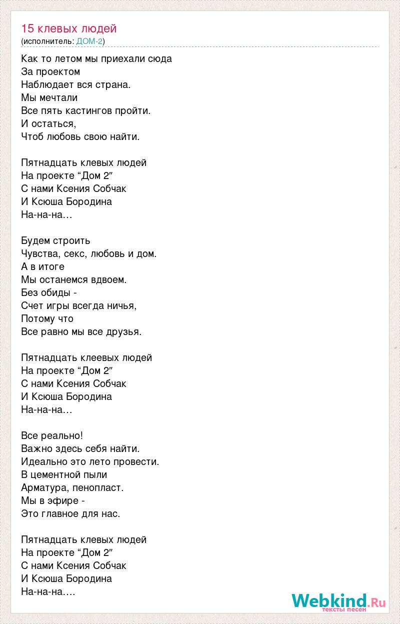 Как то летом мы приехали сюда За проектом Наблюдает вся страна. Мы мечтали Все пять кастингов пройти. И остаться, Чтоб любовь свою найти. Пятнадцать клевых людей На проекте “Дом 2″ С нами Ксения Собчак И Ксюша Бородина На-на-на… Будем строить Чувства, секс, любовь и дом. А в итоге Мы останемся вдвоем. Без обиды - Счет игры всегда ничья, Потому что Все равно мы все друзья. Пятнадцать клеевых людей На проекте “Дом 2″ С нами Ксения Собчак И Ксюша Бородина На-на-на… Все реально! Важно здесь себя найти. Идеально это лето провести. В цементной пыли Арматура, пенопласт. Мы в эфире - Это главное для нас. Пятнадцать клевых людей На проекте “Дом 2″ С нами Ксения Собчак И Ксюша Бородина На-на-на….