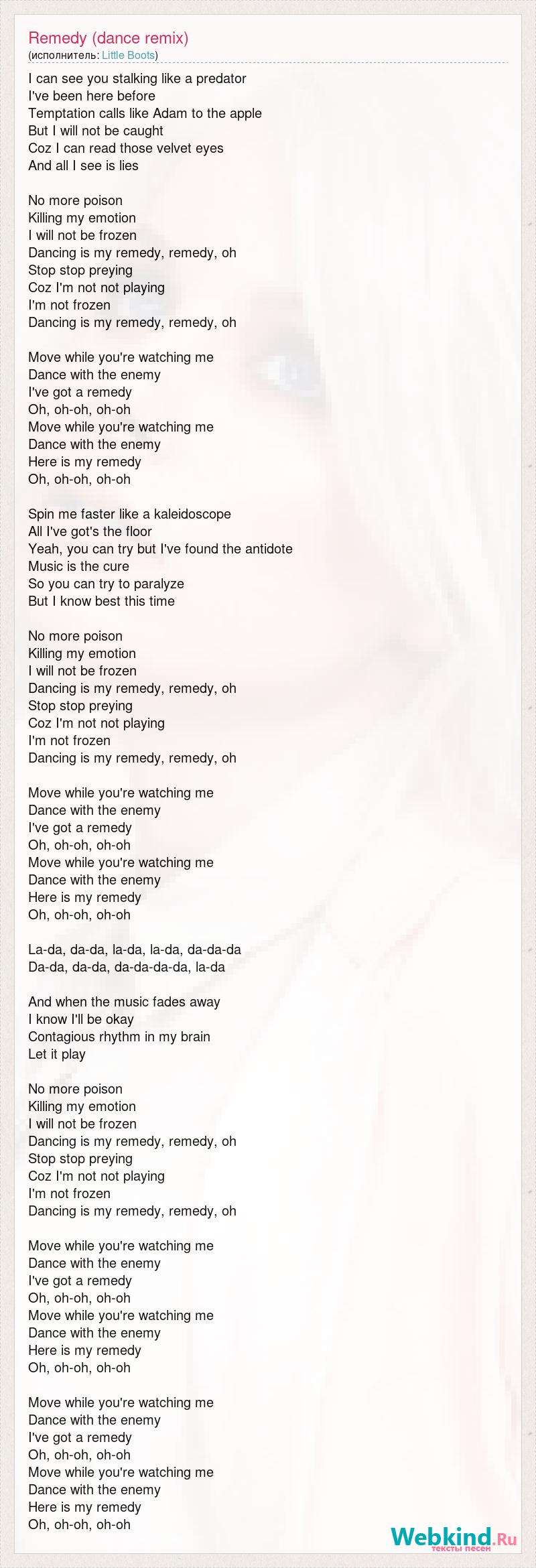 I can see you stalking like a predator I've been here before Temptation calls like Adam to the apple But I will not be caught Coz I can read those velvet eyes And all I see is lies No more poison Killing my emotion I will not be frozen Dancing is my remedy, remedy, oh Stop stop preying Coz I'm not not playing I'm not frozen Dancing is my remedy, remedy, oh Move while you're watching me Dance with the enemy I've got a remedy Oh, oh-oh, oh-oh Move while you're watching me Dance with the enemy Here is my remedy Oh, oh-oh, oh-oh Spin me faster like a kaleidoscope All I've got's the floor Yeah, you can try but I've found the antidote Music is the cure So you can try to paralyze But I know best this time No more poison Killing my emotion I will not be frozen Dancing is my remedy, remedy, oh Stop stop preying Coz I'm not not playing I'm not frozen Dancing is my remedy, remedy, oh Move while you're watching me Dance with the enemy I've got a remedy Oh, oh-oh, oh-oh Move while you're watching me Dance with the enemy Here is my remedy Oh, oh-oh, oh-oh La-da, da-da, la-da, la-da, da-da-da Da-da, da-da, da-da-da-da, la-da And when the music fades away I know I'll be okay Contagious rhythm in my brain Let it play No more poison Killing my emotion I will not be frozen Dancing is my remedy, remedy, oh Stop stop preying Coz I'm not not playing I'm not frozen Dancing is my remedy, remedy, oh Move while you're watching me Dance with the enemy I've got a remedy Oh, oh-oh, oh-oh Move while you're watching me Dance with the enemy Here is my remedy Oh, oh-oh, oh-oh Move while you're watching me Dance with the enemy I've got a remedy Oh, oh-oh, oh-oh Move while you're watching me Dance with the enemy Here is my remedy Oh, oh-oh, oh-oh