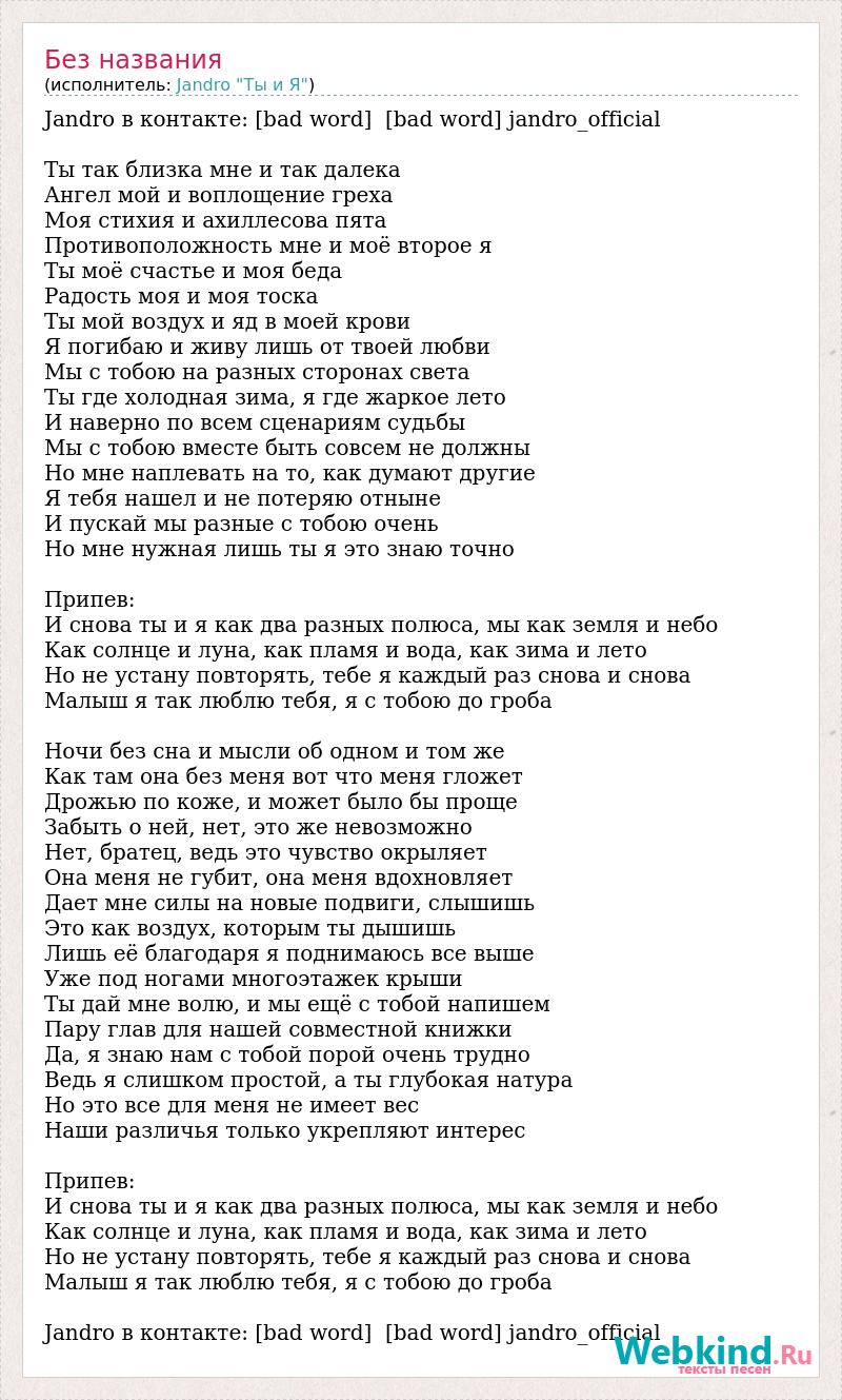 Jandro в контакте: [bad word] [bad word] jandro_official Ты так близка мне и так далека Ангел мой и воплощение греха Моя стихия и ахиллесова пята Противоположность мне и моё второе я Ты моё счастье и моя беда Радость моя и моя тоска Ты мой воздух и яд в моей крови Я погибаю и живу лишь от твоей любви Мы с тобою на разных сторонах света Ты где холодная зима, я где жаркое лето И наверно по всем сценариям судьбы Мы с тобою вместе быть совсем не должны Но мне наплевать на то, как думают другие Я тебя нашел и не потеряю отныне И пускай мы разные с тобою очень Но мне нужная лишь ты я это знаю точно Припев: И снова ты и я как два разных полюса, мы как земля и небо Как солнце и луна, как пламя и вода, как зима и лето Но не устану повторять, тебе я каждый раз снова и снова Малыш я так люблю тебя, я с тобою до гроба Ночи без сна и мысли об одном и том же Как там она без меня вот что меня гложет Дрожью по коже, и может было бы проще Забыть о ней, нет, это же невозможно Нет, братец, ведь это чувство окрыляет Она меня не губит, она меня вдохновляет Дает мне силы на новые подвиги, слышишь Это как воздух, которым ты дышишь Лишь её благодаря я поднимаюсь все выше Уже под ногами многоэтажек крыши Ты дай мне волю, и мы ещё с тобой напишем Пару глав для нашей совместной книжки Да, я знаю нам с тобой порой очень трудно Ведь я слишком простой, а ты глубокая натура Но это все для меня не имеет вес Наши различья только укрепляют интерес Припев: И снова ты и я как два разных полюса, мы как земля и небо Как солнце и луна, как пламя и вода, как зима и лето Но не устану повторять, тебе я каждый раз снова и снова Малыш я так люблю тебя, я с тобою до гроба Jandro в контакте: [bad word] [bad word] jandro_official