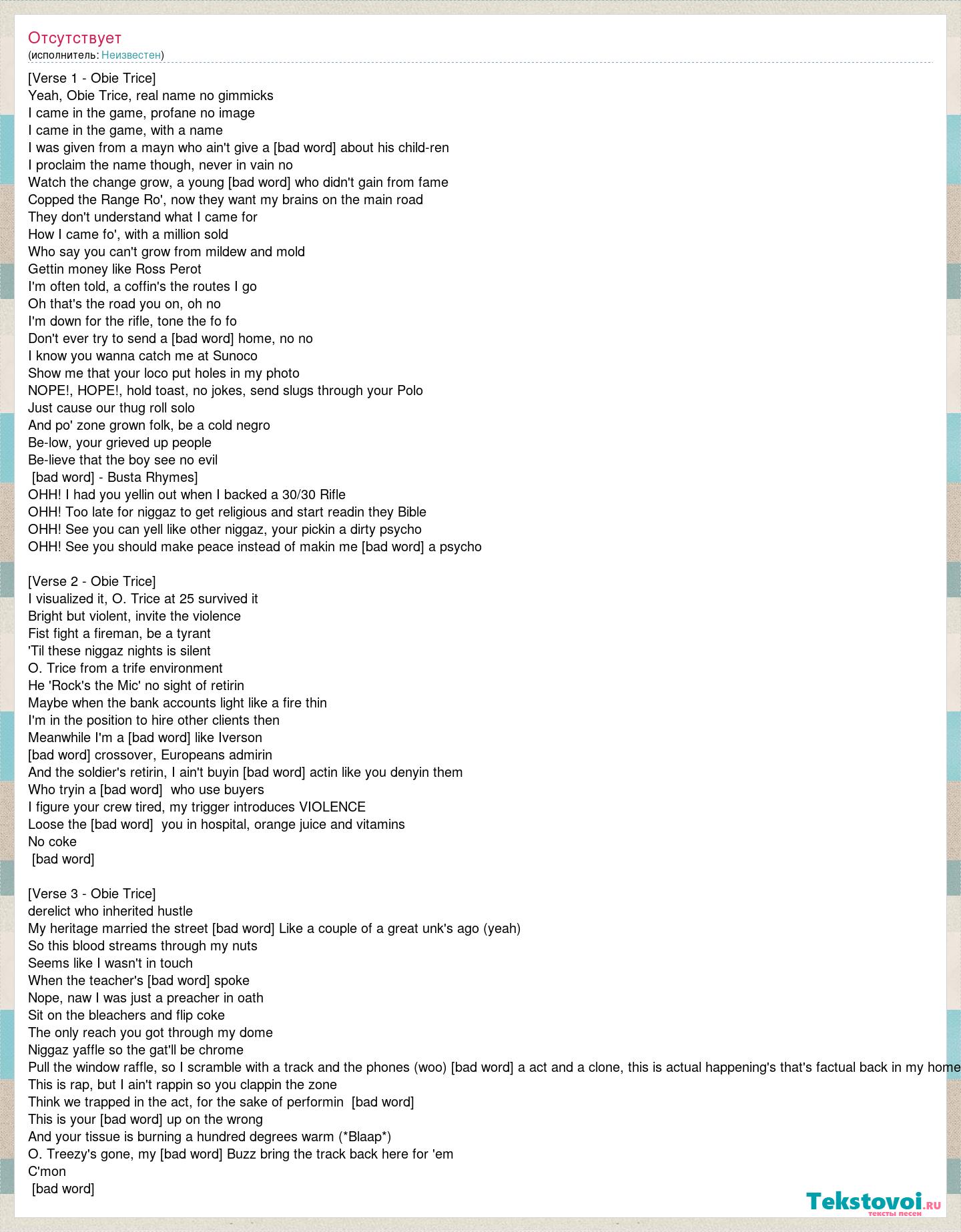 [Verse 1 - Obie Trice] Yeah, Obie Trice, real name no gimmicks I came in the game, profane no image I came in the game, with a name I was given from a mayn who ain't give a [bad word] about his child-ren I proclaim the name though, never in vain no Watch the change grow, a young [bad word] who didn't gain from fame Copped the Range Ro', now they want my brains on the main road They don't understand what I came for How I came fo', with a million sold Who say you can't grow from mildew and mold Gettin money like Ross Perot I'm often told, a coffin's the routes I go Oh that's the road you on, oh no I'm down for the rifle, tone the fo fo Don't ever try to send a [bad word] home, no no I know you wanna catch me at Sunoco Show me that your loco put holes in my photo NOPE!, HOPE!, hold toast, no jokes, send slugs through your Polo Just cause our thug roll solo And po' zone grown folk, be a cold negro Be-low, your grieved up people Be-lieve that the boy see no evil [Chorus - Busta Rhymes] OHH! I had you yellin out when I backed a 30/30 Rifle OHH! Too late for niggaz to get religious and start readin they Bible OHH! See you can yell like other niggaz, your pickin a dirty psycho OHH! See you should make peace instead of makin me become a psycho [Verse 2 - Obie Trice] I visualized it, O. Trice at 25 survived it Bright but violent, invite the violence Fist fight a fireman, be a tyrant 'Til these niggaz nights is silent O. Trice from a trife environment He 'Rock's the Mic' no sight of retirin Maybe when the bank accounts light like a fire thin I'm in the position to hire other clients then Meanwhile I'm a virus like Iverson [bad word] crossover, Europeans admirin And the soldier's retirin, I ain't buyin [bad word] actin like you denyin them Who tryin a [bad word] who use buyers I figure your crew tired, my trigger introduces VIOLENCE Loose the sirus, you in hospital, orange juice and vitamins No coke [Chorus] [Verse 3 - Obie Trice] derelict who inherited hustle My heritage married the street struggle Like a couple of a great unk's ago (yeah) So this blood streams through my nuts Seems like I wasn't in touch When the teacher's [bad word] spoke Nope, naw I was just a preacher in oath Sit on the bleachers and flip coke The only reach you got through my dome Niggaz yaffle so the gat'll be chrome Pull the window raffle, so I scramble with a track and the phones (woo) [bad word] a act and a clone, this is actual happening's that's factual back in my home This is rap, but I ain't rappin so you clappin the zone Think we trapped in the act, for the sake of performin [bad word] This is your warnin, run up on the wrong And your tissue is burning a hundred degrees warm (*Blaap*) O. Treezy's gone, my [bad word] Buzz bring the track back here for 'em C'mon [Chorus]