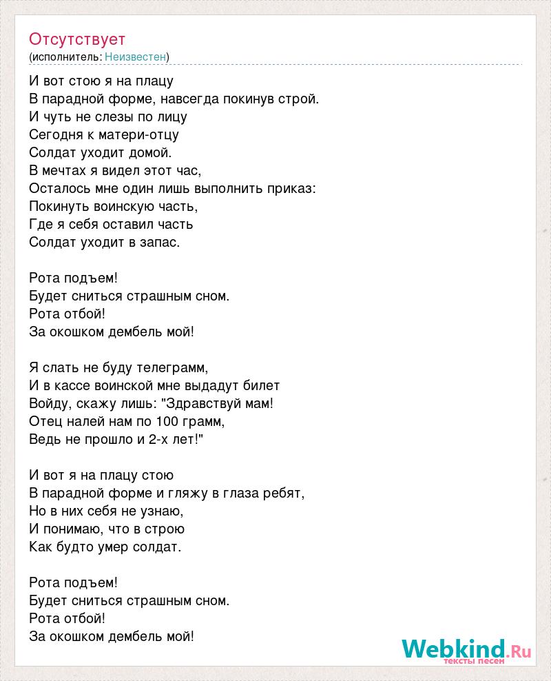 И вот стою я на плацу В парадной форме, навсегда покинув строй. И чуть не слезы по лицу Сегодня к матери-отцу Солдат уходит домой. В мечтах я видел этот час, Осталось мне один лишь выполнить приказ: Покинуть воинскую часть, Где я себя оставил часть Солдат уходит в запас. Рота подъем! Будет сниться страшным сном. Рота отбой! За окошком дембель мой! Я слать не буду телеграмм, И в кассе воинской мне выдадут билет Войду, скажу лишь: "Здравствуй мам! Отец налей нам по 100 грамм, Ведь не прошло и 2-х лет!" И вот я на плацу стою В парадной форме и гляжу в глаза ребят, Но в них себя не узнаю, И понимаю, что в строю Как будто умер солдат. Рота подъем! Будет сниться страшным сном. Рота отбой! За окошком дембель мой!