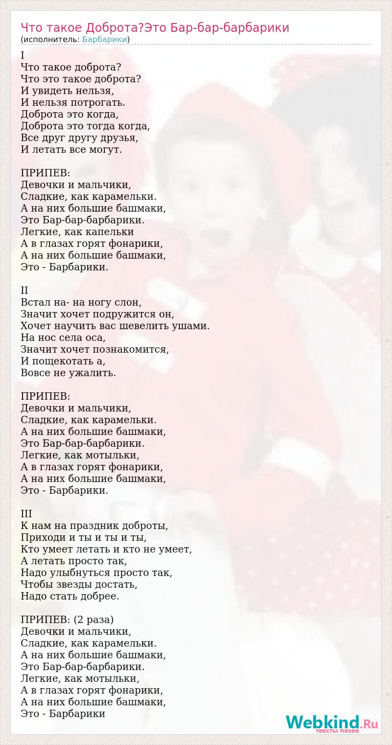 I Что такое доброта? Что это такое доброта? И увидеть нельзя, И нельзя потрогать. Доброта это когда, Доброта это тогда когда, Все друг другу друзья, И летать все могут. ПРИПЕВ: Девочки и мальчики, Сладкие, как карамельки. А на них большие башмаки, Это Бар-бар-барбарики. Легкие, как капельки А в глазах горят фонарики, А на них большие башмаки, Это - Барбарики. II Встал на- на ногу слон, Значит хочет подружится он, Хочет научить вас шевелить ушами. На нос села оса, Значит хочет познакомится, И пощекотать а, Вовсе не ужалить. ПРИПЕВ: Девочки и мальчики, Сладкие, как карамельки. А на них большие башмаки, Это Бар-бар-барбарики. Легкие, как мотыльки, А в глазах горят фонарики, А на них большие башмаки, Это - Барбарики. III К нам на праздник доброты, Приходи и ты и ты и ты, Кто умеет летать и кто не умеет, А летать просто так, Надо улыбнуться просто так, Чтобы звезды достать, Надо стать добрее. ПРИПЕВ: (2 раза) Девочки и мальчики, Сладкие, как карамельки. А на них большие башмаки, Это Бар-бар-барбарики. Легкие, как мотыльки, А в глазах горят фонарики, А на них большие башмаки, Это - Барбарики