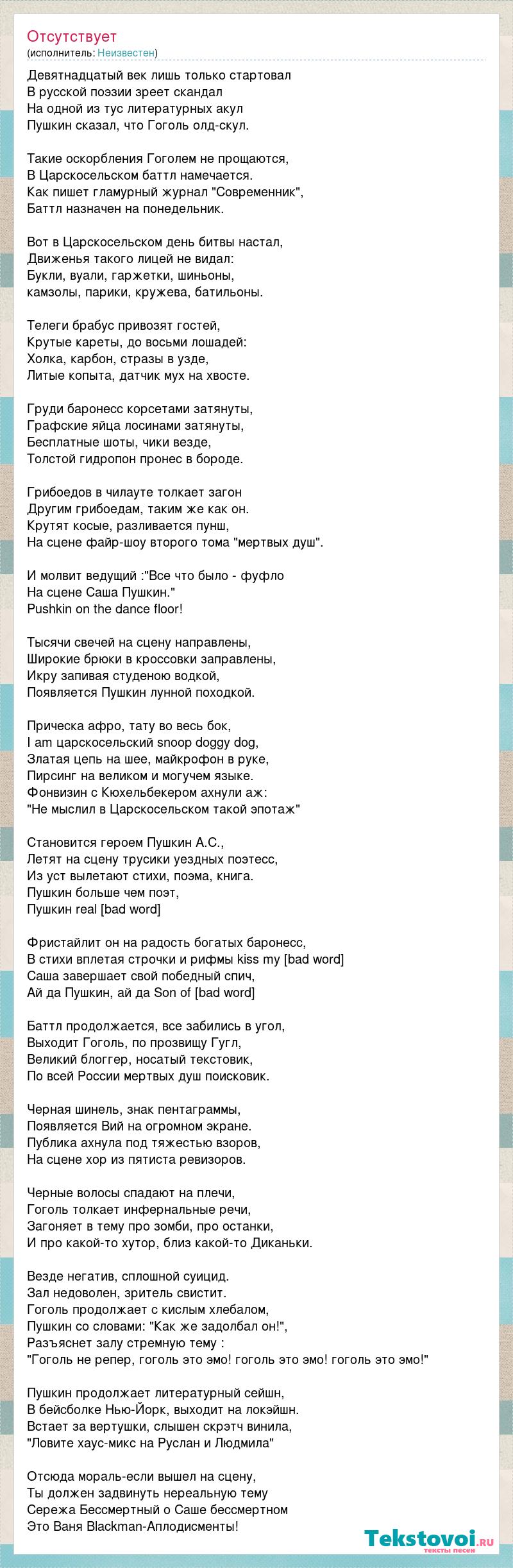 Девятнадцатый век лишь только стартовал В русской поэзии зреет скандал На одной из тус литературных акул Пушкин сказал, что Гоголь олд-скул. Такие оскорбления Гоголем не прощаются, В Царскосельском баттл намечается. Как пишет гламурный журнал "Современник", Баттл назначен на понедельник. Вот в Царскосельском день битвы настал, Движенья такого лицей не видал: Букли, вуали, гаржетки, шиньоны, камзолы, парики, кружева, батильоны. Телеги брабус привозят гостей, Крутые кареты, до восьми лошадей: Холка, карбон, стразы в узде, Литые копыта, датчик мух на хвосте. Груди баронесс корсетами затянуты, Графские яйца лосинами затянуты, Бесплатные шоты, чики везде, Толстой гидропон пронес в бороде. Грибоедов в чилауте толкает загон Другим грибоедам, таким же как он. Крутят косые, разливается пунш, На сцене файр-шоу второго тома "мертвых душ". И молвит ведущий :"Все что было - фуфло На сцене Саша Пушкин." Pushkin on the dance floor! Тысячи свечей на сцену направлены, Широкие брюки в кроссовки заправлены, Икру запивая студеною водкой, Появляется Пушкин лунной походкой. Прическа афро, тату во весь бок, I am царскосельский snoop doggy dog, Златая цепь на шее, майкрофон в руке, Пирсинг на великом и могучем языке. Фонвизин с Кюхельбекером ахнули аж: "Не мыслил в Царскосельском такой эпотаж" Становится героем Пушкин А.С., Летят на сцену трусики уездных поэтесс, Из уст вылетают стихи, поэма, книга. Пушкин больше чем поэт, Пушкин real [bad word] Фристайлит он на радость богатых баронесс, В стихи вплетая строчки и рифмы kiss my [bad word] Саша завершает свой победный спич, Ай да Пушкин, ай да Son of [bad word] Баттл продолжается, все забились в угол, Выходит Гоголь, по прозвищу Гугл, Великий блоггер, носатый текстовик, По всей России мертвых душ поисковик. Черная шинель, знак пентаграммы, Появляется Вий на огромном экране. Публика ахнула под тяжестью взоров, На сцене хор из пятиста ревизоров. Черные волосы спадают на плечи, Гоголь толкает инфернальные речи, Загоняет в тему про зомби, про останки, И про какой-то хутор, близ какой-то Диканьки. Везде негатив, сплошной суицид. Зал недоволен, зритель свистит. Гоголь продолжает с кислым хлебалом, Пушкин со словами: "Как же задолбал он!", Разъяснет залу стремную тему : "Гоголь не репер, гоголь это эмо! гоголь это эмо! гоголь это эмо!" Пушкин продолжает литературный сейшн, В бейсболке Нью-Йорк, выходит на локэйшн. Встает за вертушки, слышен скрэтч винила, "Ловите хаус-микс на Руслан и Людмила" Отсюда мораль-если вышел на сцену, Ты должен задвинуть нереальную тему Сережа Бессмертный о Саше бессмертном Это Ваня Blackman-Аплодисменты!