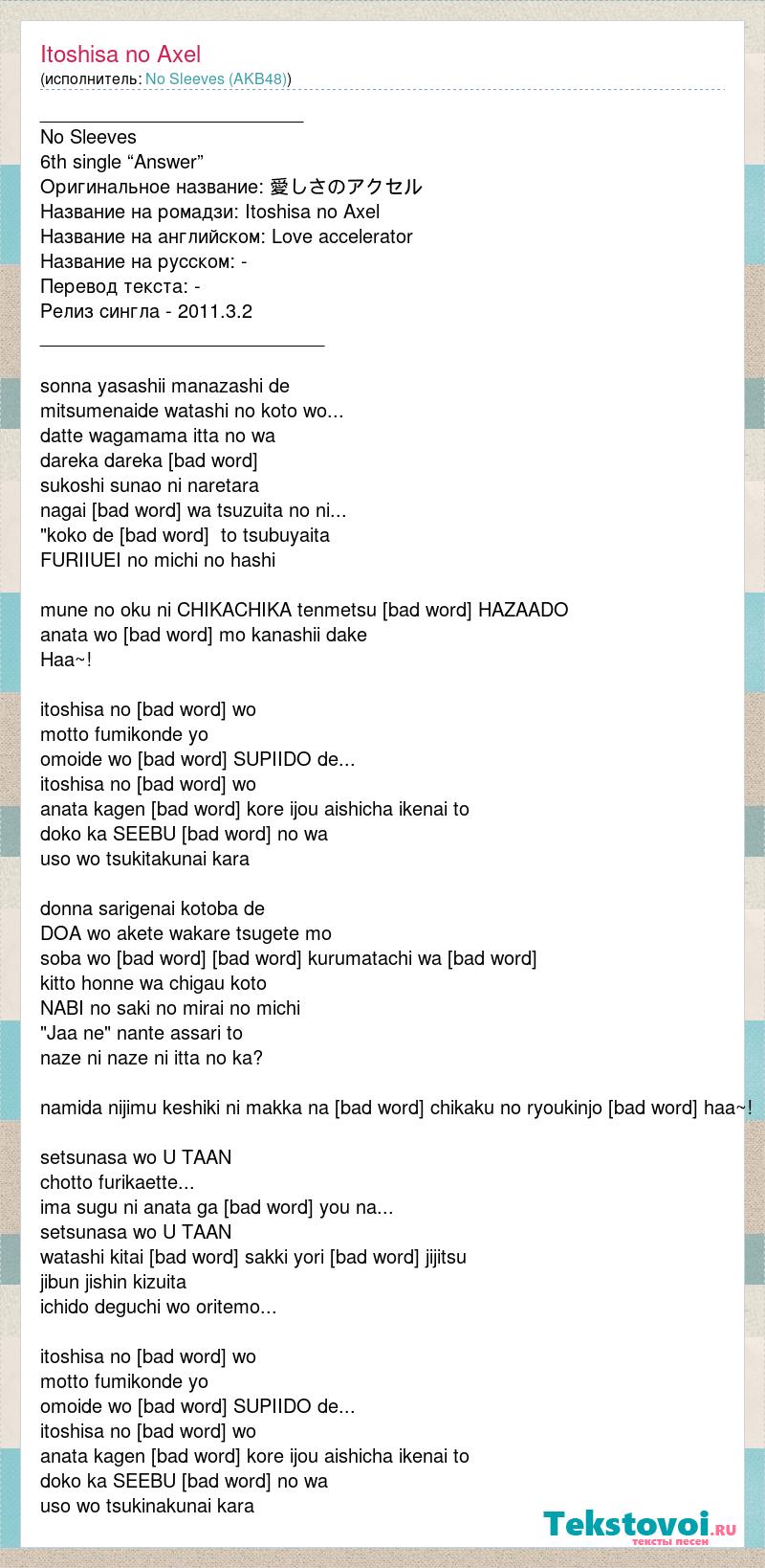 _________________________ No Sleeves 6th single “Answer” Оригинальное название: 愛しさのアクセル Название на ромадзи: Itoshisa no Axel Название на английском: Love accelerator Название на русском: - Перевод текста: - Релиз сингла - 2011.3.2 ___________________________ sonna yasashii manazashi de mitsumenaide watashi no koto wo... datte wagamama itta no wa dareka dareka wakatteru sukoshi sunao ni naretara nagai yoru wa tsuzuita no ni... "koko de oriru" to tsubuyaita FURIIUEI no michi no hashi mune no oku ni CHIKACHIKA tenmetsu [bad word] HAZAADO anata wo [bad word] mo kanashii dake Haa~! itoshisa no AKUSERU wo motto fumikonde yo omoide wo furikiru SUPIIDO de... itoshisa no AKUSERU wo anata kagen [bad word] kore ijou aishicha ikenai to doko ka SEEBU suru no wa uso wo tsukitakunai kara donna sarigenai kotoba de DOA wo akete wakare tsugete mo soba wo [bad word] toozakaru kurumatachi wa kizuiteru kitto honne wa chigau koto NABI no saki no mirai no michi "Jaa ne" nante assari to naze ni naze ni itta no ka? namida nijimu keshiki ni makka na TEERURAITO chikaku no ryoukinjo arukidasou haa~! setsunasa wo U TAAN chotto furikaette... ima sugu ni anata ga modoru you na... setsunasa wo U TAAN watashi kitai [bad word] sakki yori [bad word] jijitsu jibun jishin kizuita ichido deguchi wo oritemo... itoshisa no AKUSERU wo motto fumikonde yo omoide wo furikiru SUPIIDO de... itoshisa no AKUSERU wo anata kagen [bad word] kore ijou aishicha ikenai to doko ka SEEBU suru no wa uso wo tsukinakunai kara