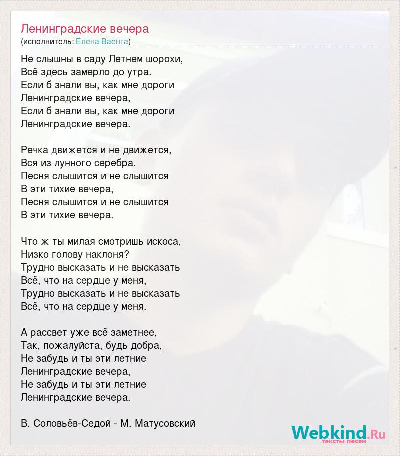 Не слышны в саду Летнем шорохи, Всё здесь замерло до утра. Если б знали вы, как мне дороги Ленинградские вечера, Если б знали вы, как мне дороги Ленинградские вечера. Речка движется и не движется, Вся из лунного серебра. Песня слышится и не слышится В эти тихие вечера, Песня слышится и не слышится В эти тихие вечера. Что ж ты милая смотришь искоса, Низко голову наклоня? Трудно высказать и не высказать Всё, что на сердце у меня, Трудно высказать и не высказать Всё, что на сердце у меня. А рассвет уже всё заметнее, Так, пожалуйста, будь добра, Не забудь и ты эти летние Ленинградские вечера, Не забудь и ты эти летние Ленинградские вечера. В. Соловьёв-Седой - М. Матусовский