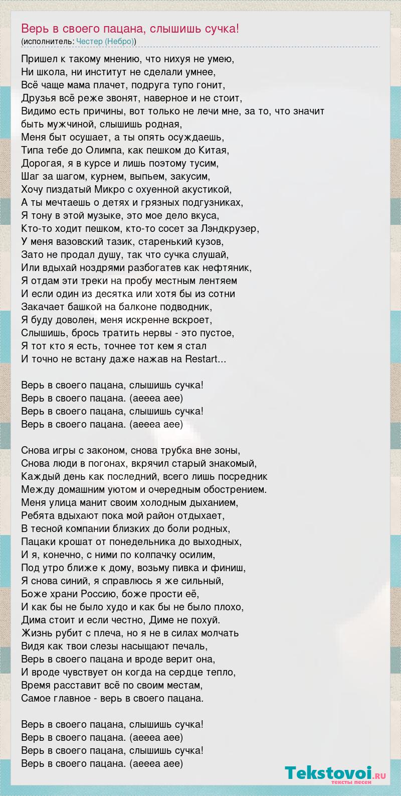 Пришел к такому мнению, что нихуя не умею, Ни школа, ни институт не сделали умнее, Всё чаще мама плачет, подруга тупо гонит, Друзья всё реже звонят, наверное и не стоит, Видимо есть причины, вот только не лечи мне, за то, что значит быть мужчиной, слышишь родная, Меня быт осушает, а ты опять осуждаешь, Типа тебе до Олимпа, как пешком до Китая, Дорогая, я в курсе и лишь поэтому тусим, Шаг за шагом, курнем, выпьем, закусим, Хочу пиздатый Микро с охуенной акустикой, А ты мечтаешь о детях и грязных подгузниках, Я тону в этой музыке, это мое дело вкуса, Кто-то ходит пешком, кто-то сосет за Лэндкрузер, У меня вазовский тазик, старенький кузов, Зато не продал душу, так что сучка слушай, Или вдыхай ноздрями разбогатев как нефтяник, Я отдам эти треки на пробу местным лентяем И если один из десятка или хотя бы из сотни Закачает башкой на балконе подводник, Я буду доволен, меня искренне вскроет, Слышишь, брось тратить нервы - это пустое, Я тот кто я есть, точнее тот кем я стал И точно не встану даже нажав на Restart... Верь в своего пацана, слышишь сучка! Верь в своего пацана. (аеееа аее) Верь в своего пацана, слышишь сучка! Верь в своего пацана. (аеееа аее) Снова игры с законом, снова трубка вне зоны, Снова люди в погонах, вкрячил старый знакомый, Каждый день как последний, всего лишь посредник Между домашним уютом и очередным обострением. Меня улица манит своим холодным дыханием, Ребята вдыхают пока мой район отдыхает, В тесной компании близких до боли родных, Пацаки крошат от понедельника до выходных, И я, конечно, с ними по колпачку осилим, Под утро ближе к дому, возьму пивка и финиш, Я снова синий, я справлюсь я же сильный, Боже храни Россию, боже прости её, И как бы не было худо и как бы не было плохо, Дима стоит и если честно, Диме не похуй. Жизнь рубит с плеча, но я не в силах молчать Видя как твои слезы насыщают печаль, Верь в своего пацана и вроде верит она, И вроде чувствует он когда на сердце тепло, Время расставит всё по своим местам, Самое главное - верь в своего пацана. Верь в своего пацана, слышишь сучка! Верь в своего пацана. (аеееа аее) Верь в своего пацана, слышишь сучка! Верь в своего пацана. (аеееа аее)