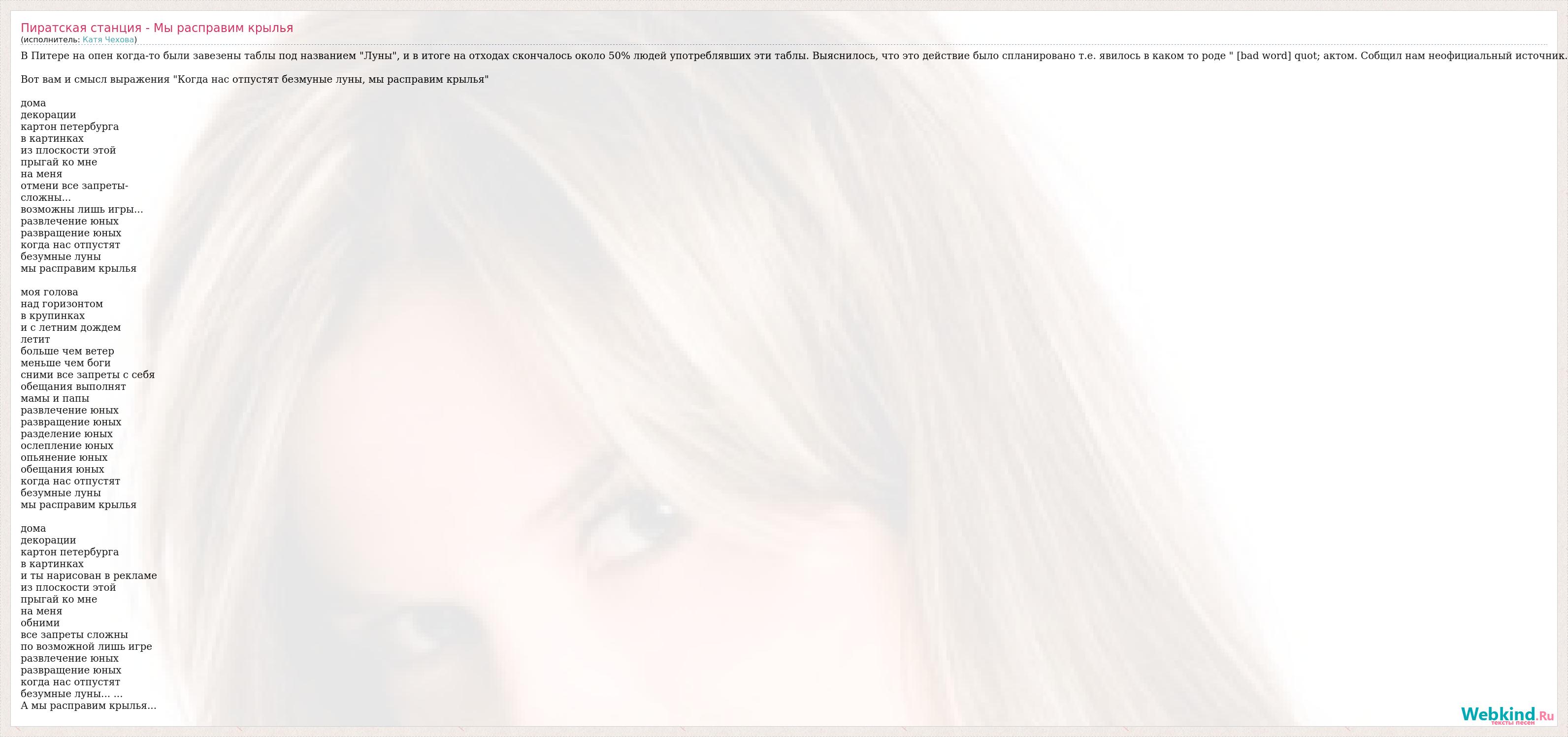 В Питере на опен когда-то были завезены таблы под названием "Луны", и в итоге на отходах скончалось около 50% людей употреблявших эти таблы. Выяснилось, что это действие было спланировано т.е. явилось в каком то роде " [bad word] quot; актом. Собщил нам неофициальный источник. Вот вам и смысл выражения "Когда нас отпустят безмуные луны, мы расправим крылья" дома декорации картон петербурга в картинках из плоскости этой прыгай ко мне на меня отмени все запреты- сложны... возможны лишь игры... развлечение юных развращение юных когда нас отпустят безумные луны мы расправим крылья моя голова над горизонтом в крупинках и с летним дождем летит больше чем ветер меньше чем боги сними все запреты с себя обещания выполнят мамы и папы развлечение юных развращение юных разделение юных ослепление юных опьянение юных обещания юных когда нас отпустят безумные луны мы расправим крылья дома декорации картон петербурга в картинках и ты нарисован в рекламе из плоскости этой прыгай ко мне на меня обними все запреты сложны по возможной лишь игре развлечение юных развращение юных когда нас отпустят безумные луны... ... А мы расправим крылья...