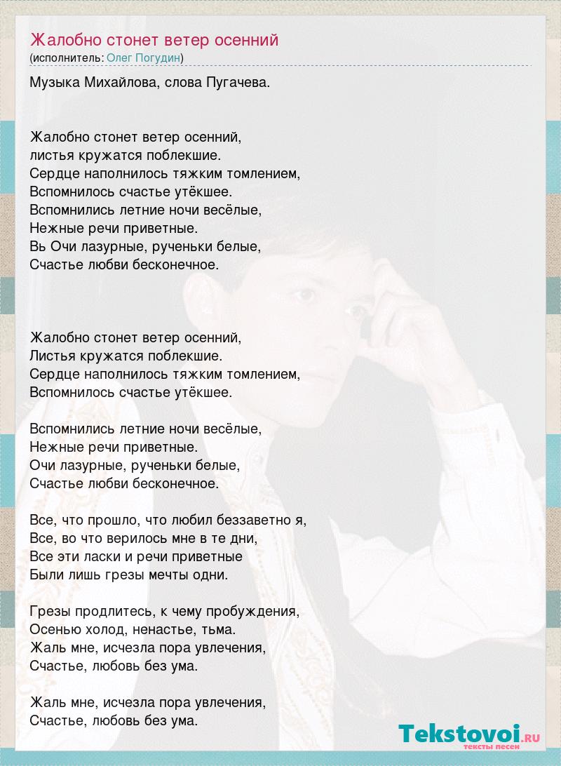 Музыка Михайлова, слова Пугачева. Жалобно стонет ветер осенний, листья кружатся поблекшие. Сердце наполнилось тяжким томлением, Вспoмнилось счастье утёкшее. Вспомнились летние ночи весёлые, Нежные речи приветные. Bь Очи лазурные, рученьки белые, Счастье любви бесконечное. Жалобно стонет ветер осенний, Листья кружатся поблекшие. Сердце наполнилось тяжким томлением, Вспoмнилось счастье утёкшее. Вспомнились летние ночи весёлые, Нежные речи приветные. Очи лазурные, рученьки белые, Счастье любви бесконечное. Все, что прошло, что любил беззаветно я, Все, во что верилось мне в те дни, Все эти ласки и речи приветные Были лишь грезы мечты одни. Грезы продлитесь, к чему пробуждения, Осенью холод, ненастье, тьма. Жаль мне, исчезла пора увлечения, Счастье, любовь без ума. Жаль мне, исчезла пора увлечения, Счастье, любовь без ума.