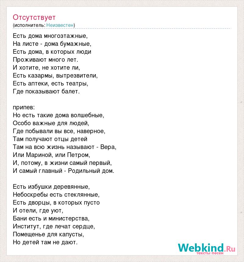 Есть дома многозтажные, Hа листе - дома бумажные, Есть дома, в которых люди Проживают много лет. И хотите, не хотите ли, Есть казармы, вытрезвители, Есть аптеки, есть театры, Где показывают балет. припев: Hо есть такие дома волшебные, Особо важные для людей, Где побывали вы все, наверное, Там получают отцы детей Там на всю жизнь называют - Вера, Или Мариной, или Петром, И, потому, в жизни самый первый, И самый главный - Родильный дом. Есть избушки деревянные, Hебоскребы есть стеклянные, Есть дворцы, в которых пусто И отели, где уют, Бани есть и министерства, Институт, где лечат сердце, Помещенье для капусты, Hо детей там не дают.
