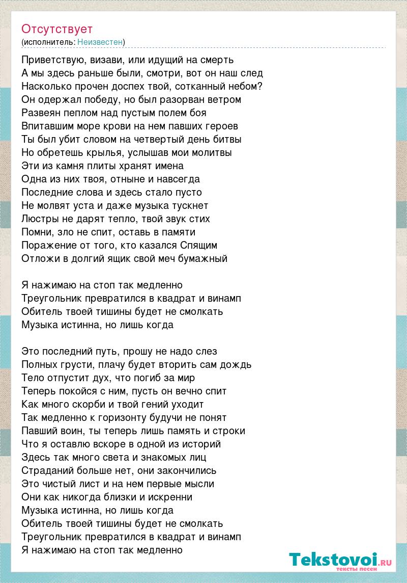 Приветствую, визави, или идущий на смерть А мы здесь раньше были, смотри, вот он наш след Насколько прочен доспех твой, сотканный небом? Он одержал победу, но был разорван ветром Развеян пеплом над пустым полем боя Впитавшим море крови на нем павших героев Ты был убит словом на четвертый день битвы Но обретешь крылья, услышав мои молитвы Эти из камня плиты хранят имена Одна из них твоя, отныне и навсегда Последние слова и здесь стало пусто Не молвят уста и даже музыка тускнет Люстры не дарят тепло, твой звук стих Помни, зло не спит, оставь в памяти Поражение от того, кто казался Спящим Отложи в долгий ящик свой меч бумажный Я нажимаю на стоп так медленно Треугольник превратился в квадрат и винамп Обитель твоей тишины будет не смолкать Музыка истинна, но лишь когда Это последний путь, прошу не надо слез Полных грусти, плачу будет вторить сам дождь Тело отпустит дух, что погиб за мир Теперь покойся с ним, пусть он вечно спит Как много скорби и твой гений уходит Так медленно к горизонту будучи не понят Павший воин, ты теперь лишь память и строки Что я оставлю вскоре в одной из историй Здесь так много света и знакомых лиц Страданий больше нет, они закончились Это чистый лист и на нем первые мысли Они как никогда близки и искренни Музыка истинна, но лишь когда Обитель твоей тишины будет не смолкать Треугольник превратился в квадрат и винамп Я нажимаю на стоп так медленно